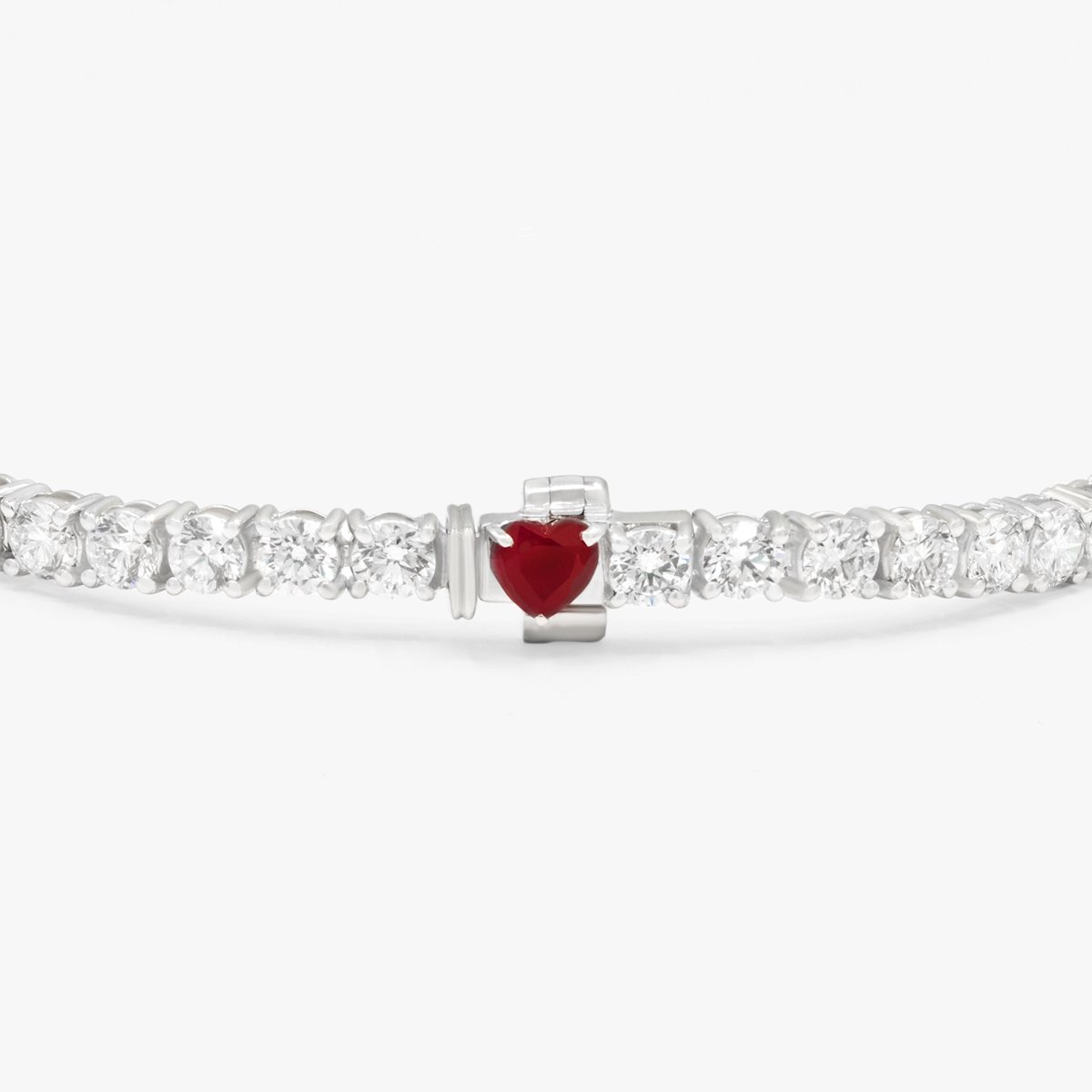 Classic round-shaped tennis bracelet featuring a striking ruby heart lock, crafted with the finest quality natural diamonds. Each diamond above 0.4 carats is GIA Certified. F, G & H colors and VS+ clarity.