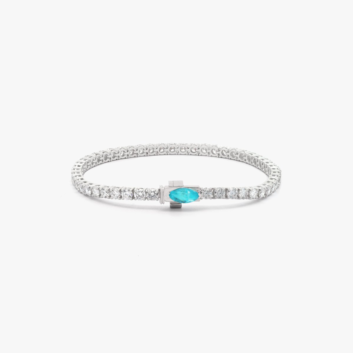 A stunning round-shaped tennis bracelet highlighted by a marquise-shaped Paraiba tourmaline lock. This exquisite piece features fine-quality natural diamonds, each above 0.4 carats and GIA Certified, available in F, G, and H colors with VS+ clarity.
