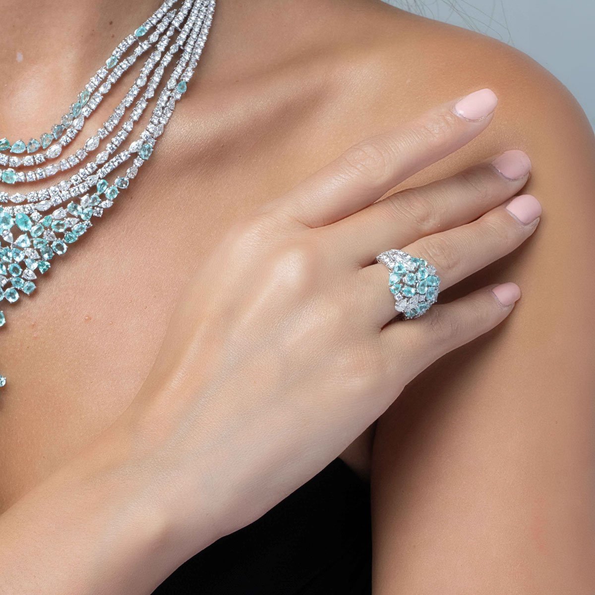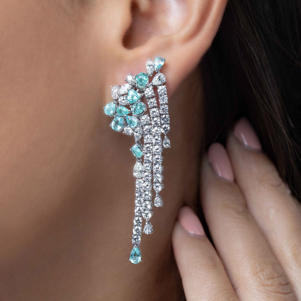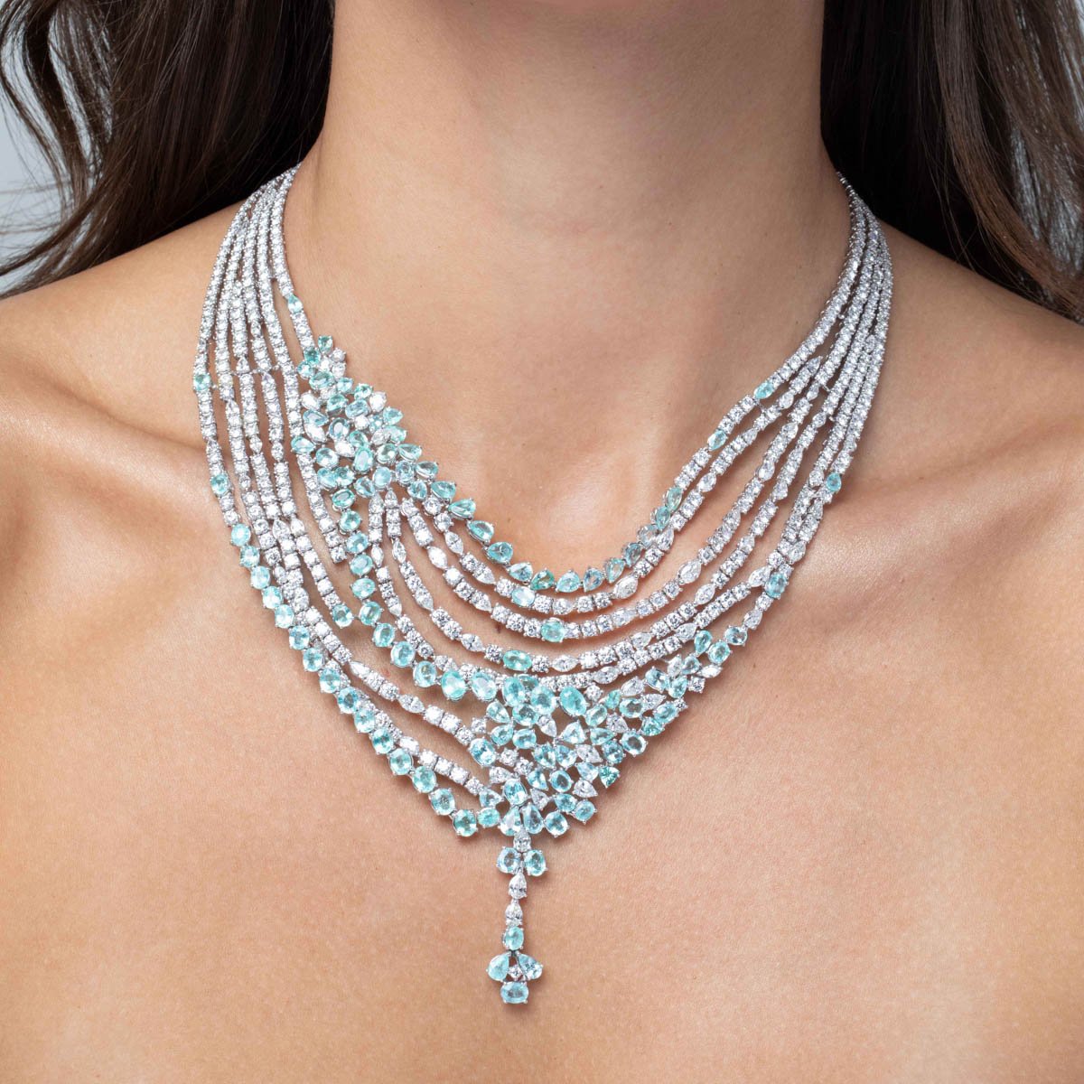 This stunning high jewelry set is a masterpiece, combining marquise, round, trilliant, and pear-shaped natural diamonds with pear and oval-shaped Paraiba tourmaline gemstones. The harmonious blend of these precious stones creates a symphony of brilliance and color. Each diamond above 0.3 carats is GIA Certified, with F-H colors and VS+ clarity.