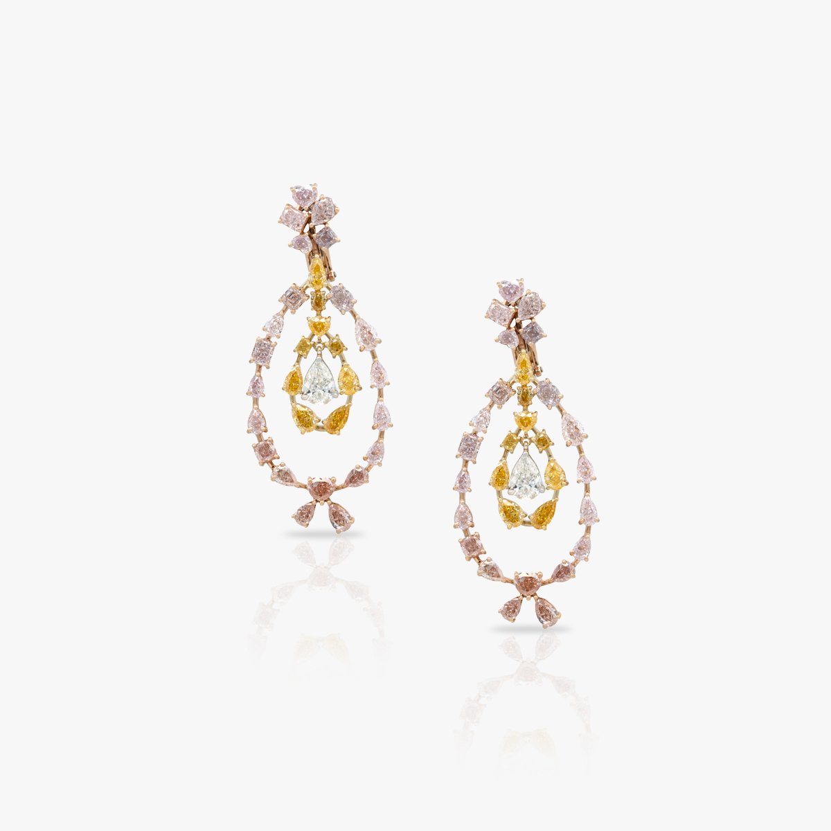 A stunning high jewellery set featuring rare colored natural diamonds in pink, yellow, and white. This set showcases a variety of diamond cuts, including marquise, heart, pear, cushion, and trilliant, along with emerald-cut diamonds. Each diamond above 0.3 carats is GIA Certified, ensuring the highest quality with F-H colors and VS+ clarity.