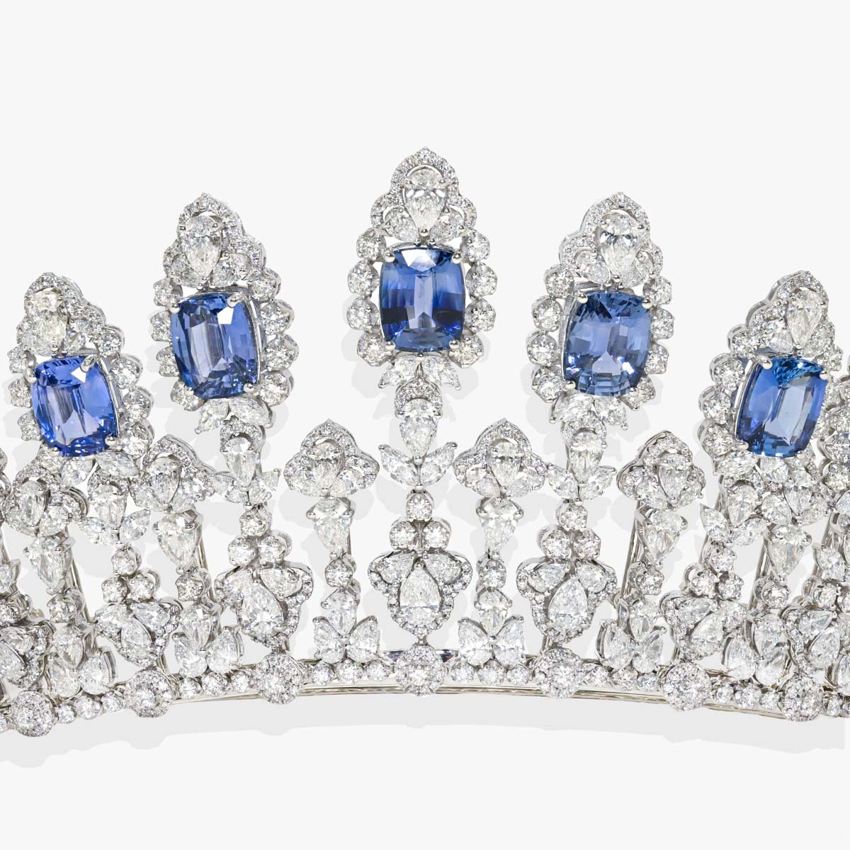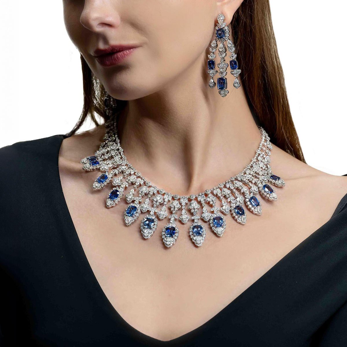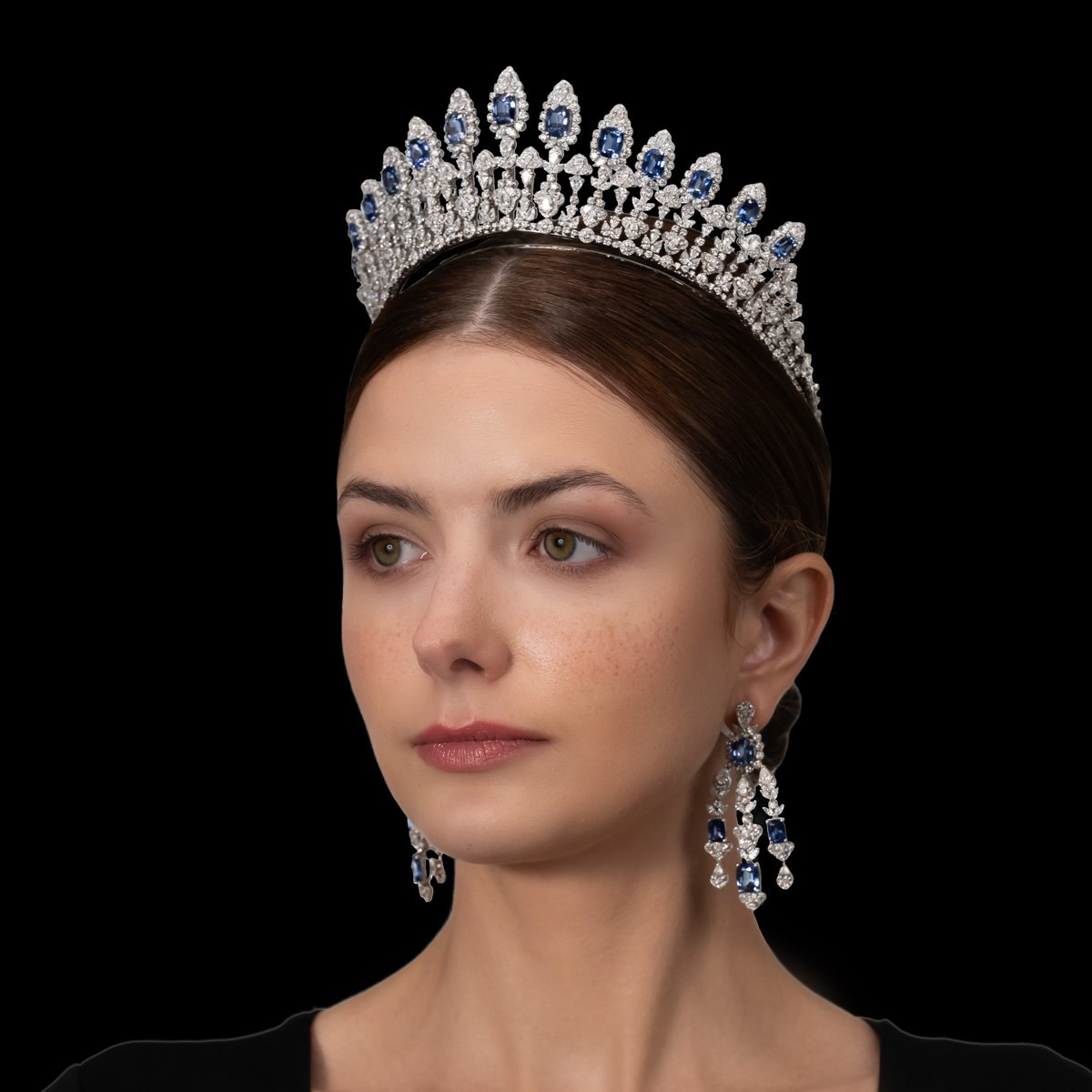 A high jewellery set adorned with majestic blue sapphires and natural diamonds. This versatile set transforms from a tiara to a necklace, with marquise diamonds and cushion-cut sapphires shimmering like stars in the night sky. Each diamond above 0.3 carats is GIA Certified, with F-H colors and VS+ clarity, making this set a symbol of royalty and luxury.