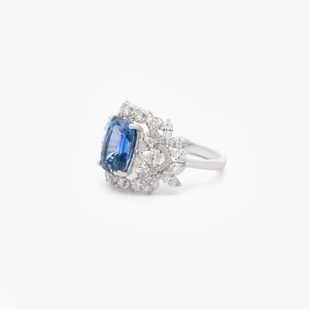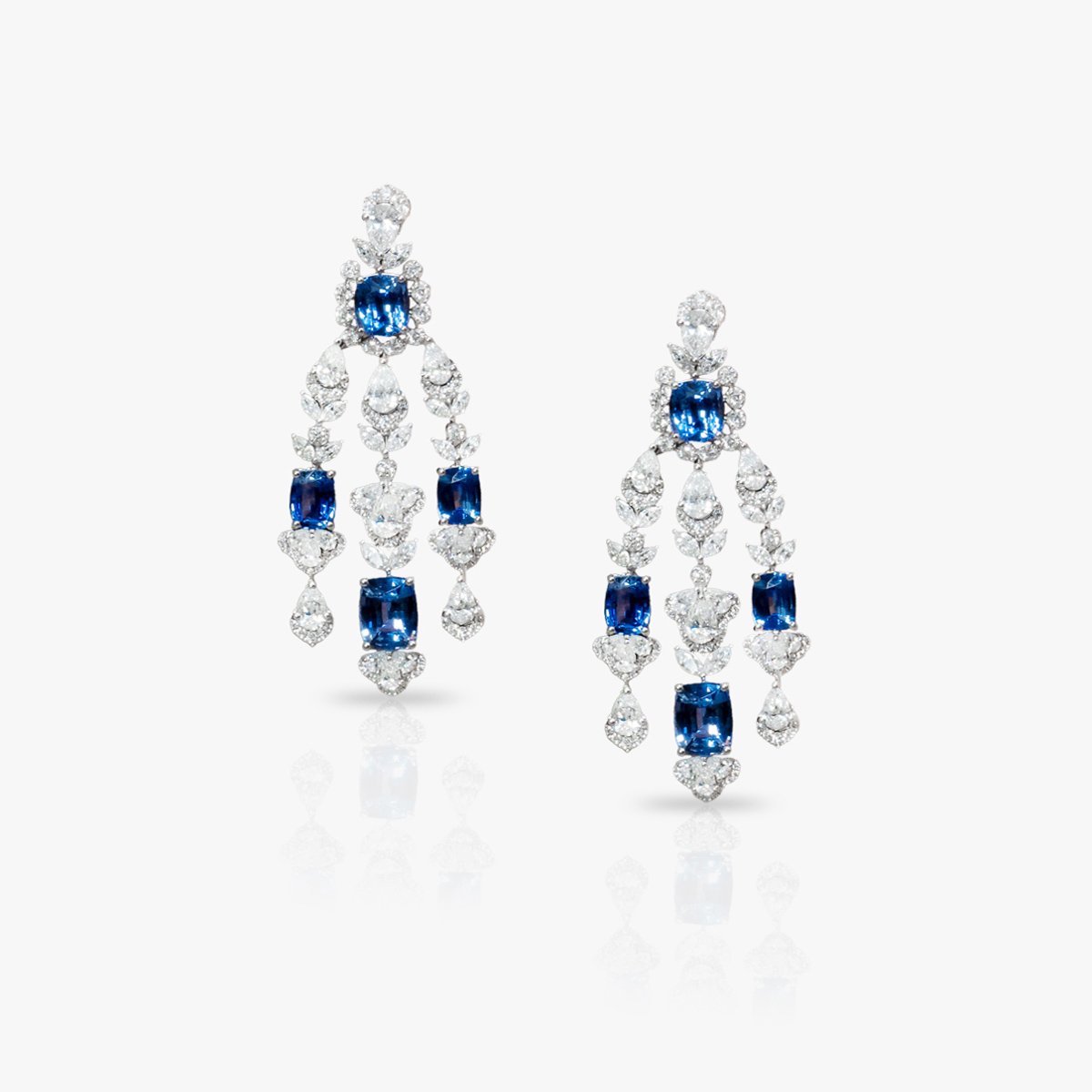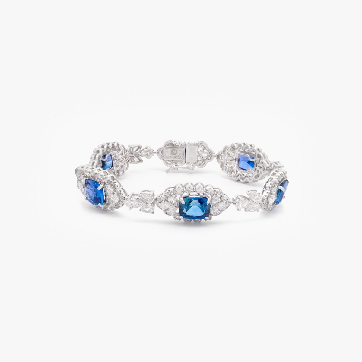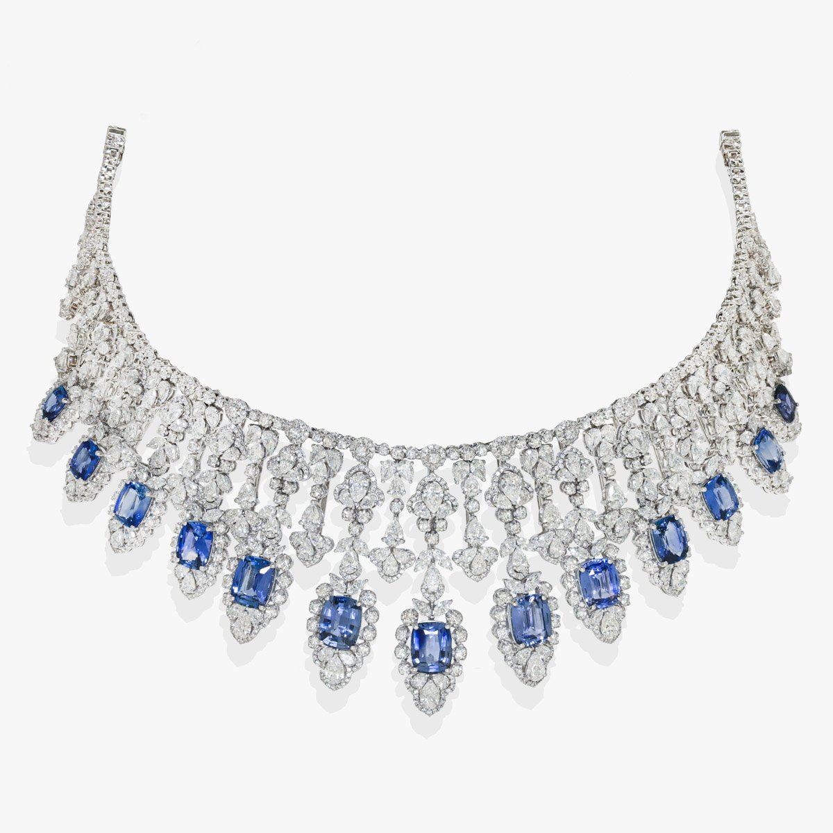 A high jewellery set adorned with majestic blue sapphires and natural diamonds. This versatile set transforms from a tiara to a necklace, with marquise diamonds and cushion-cut sapphires shimmering like stars in the night sky. Each diamond above 0.3 carats is GIA Certified, with F-H colors and VS+ clarity, making this set a symbol of royalty and luxury.