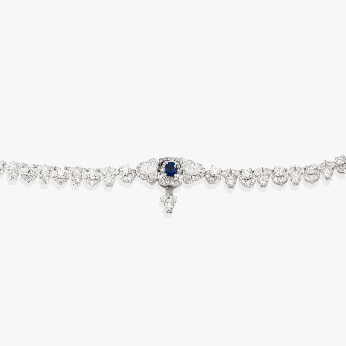 An epitome of luxury, featuring a magnificent blend of Paraiba tourmaline, blue sapphires, and white diamonds. This exquisite piece is meticulously crafted to create a harmonious blend of brilliance and sophistication.