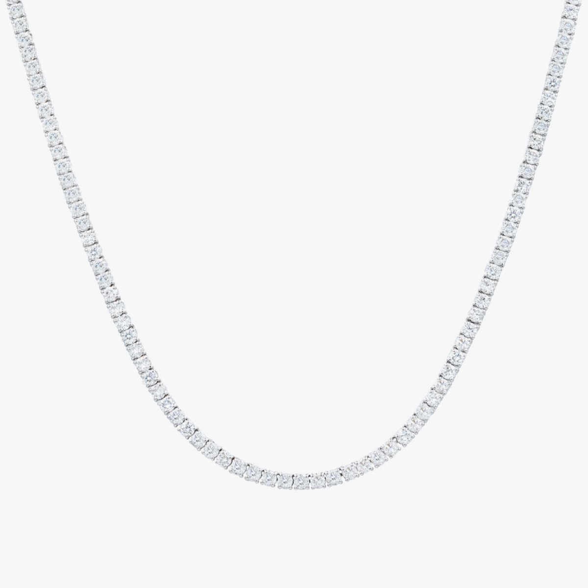 The Classic Tennis Necklace, featuring round-shaped diamonds. This petite necklace is ideal for layering or wearing alone as a delicate statement piece.