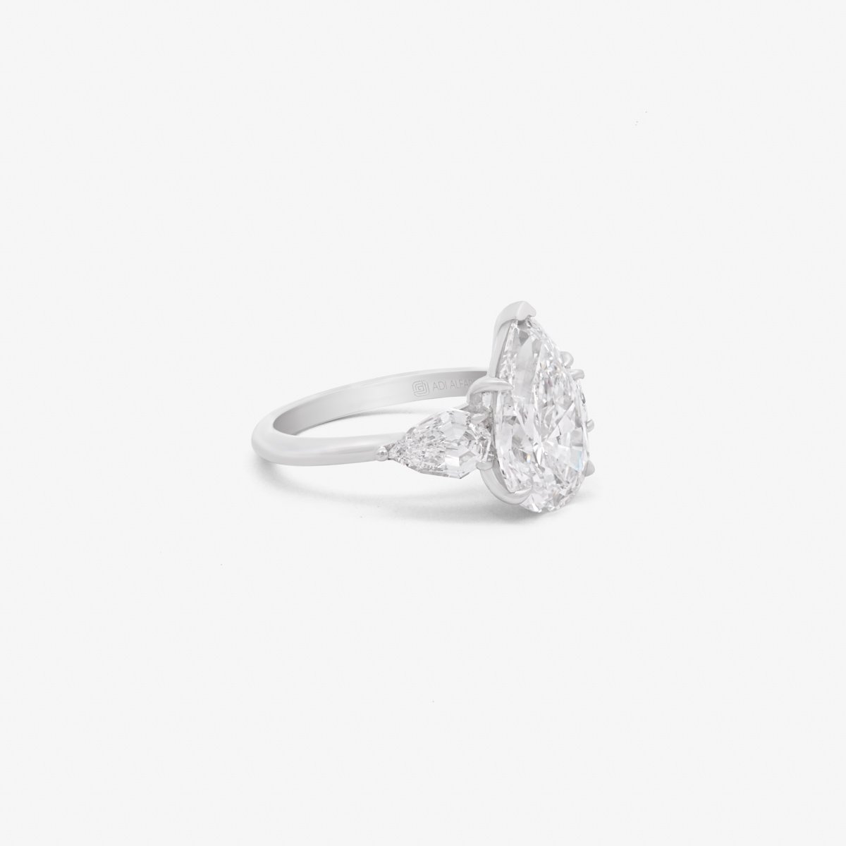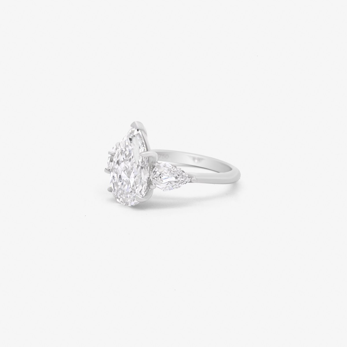 A beautiful ring featuring a pear-shaped center diamond with pear-shaped side diamonds, creating a stunning trilogy design. Diamonds above 0.3 carats are GIA Certified.