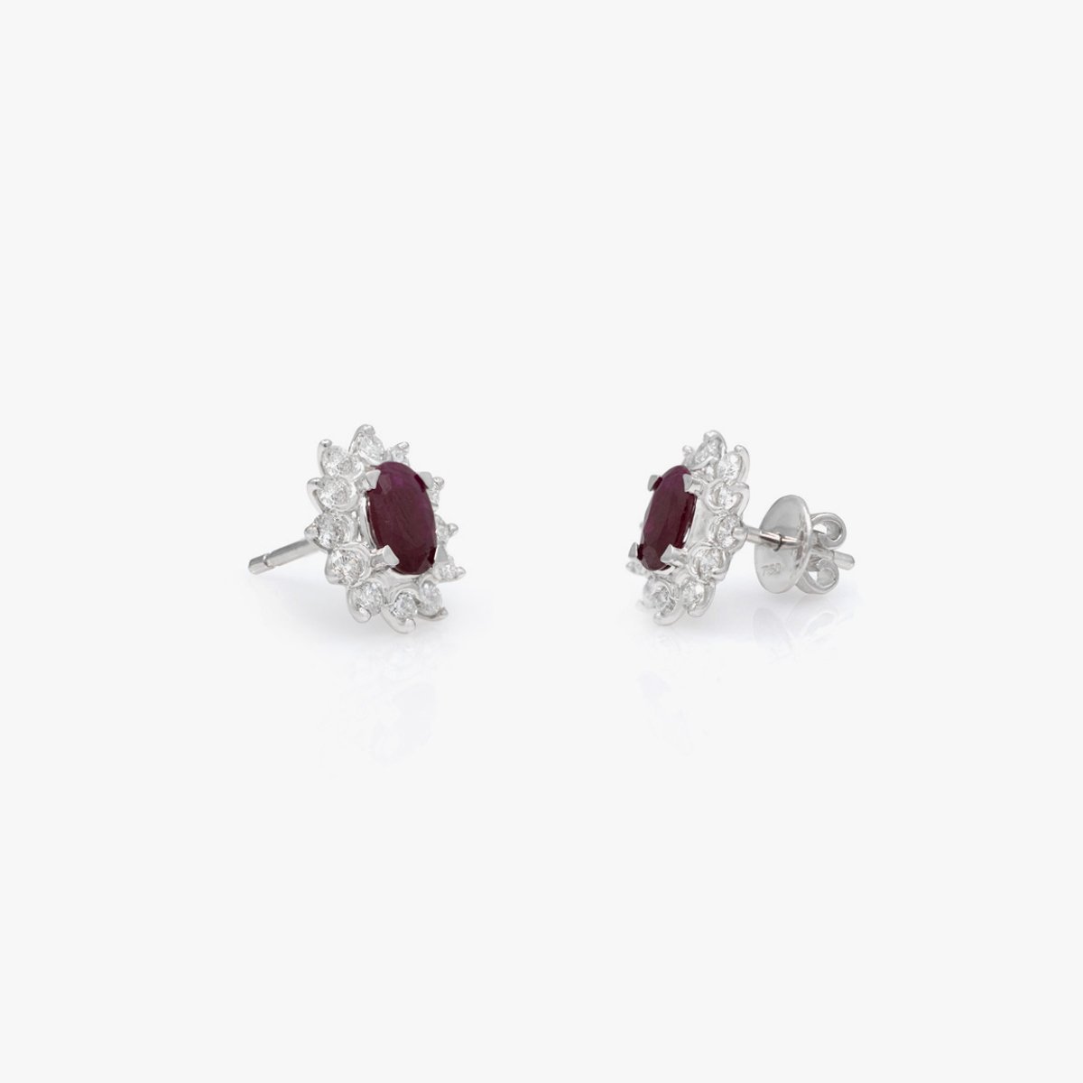 Feature an oval-shaped ruby at the center, surrounded by round-shaped white diamonds. The intense red of the ruby combined with the brilliance of diamonds makes these earrings a striking statement of passion.