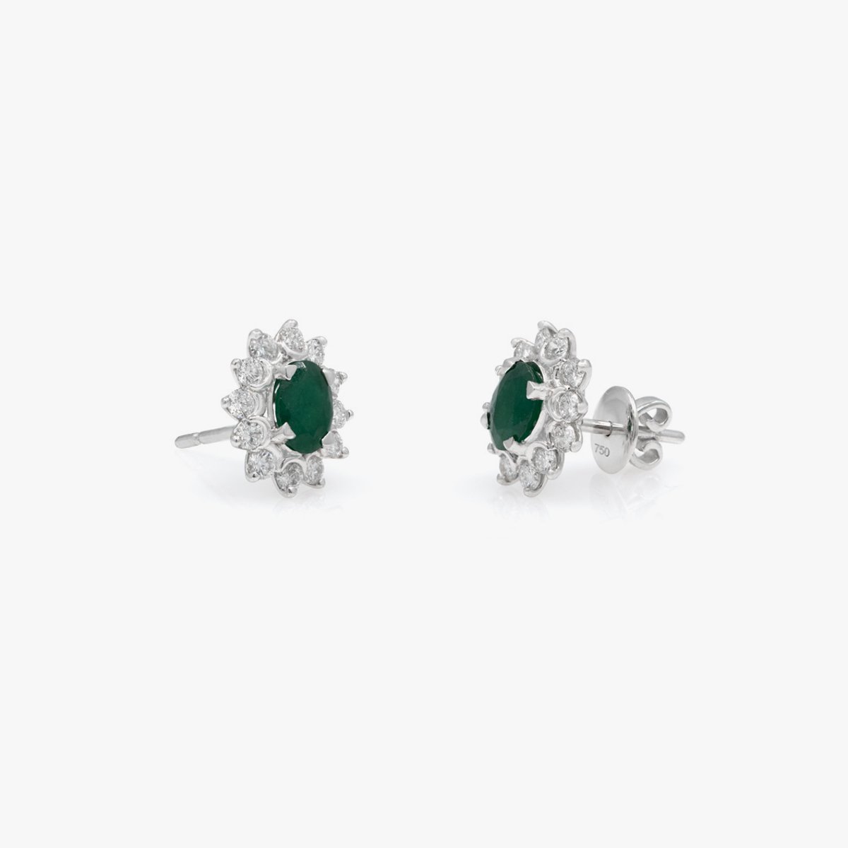 Feature an oval-shaped green emerald at the center, surrounded by round-shaped white diamonds. These earrings embody the lush beauty of emeralds, making them a perfect accessory for any occasion.