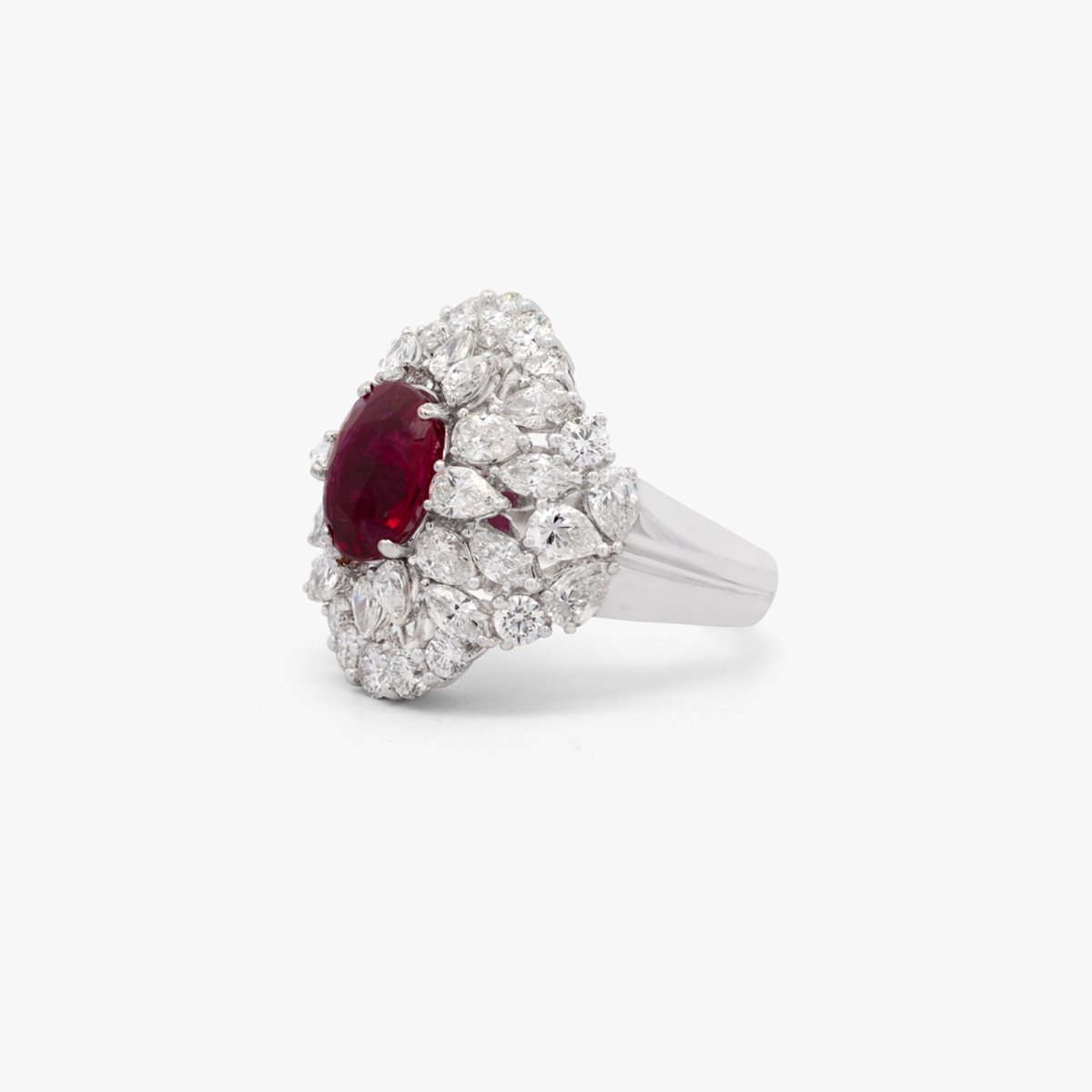An oval ruby at the heart, surrounded by pear-shaped and round diamonds, exuding regal charm.