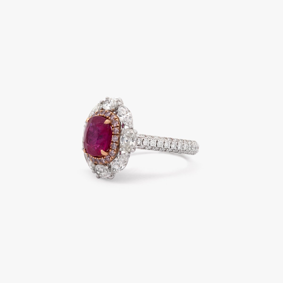 A cushion-cut ruby center, adorned with round and marquise diamonds on a pave band, celebrating timeless elegance.