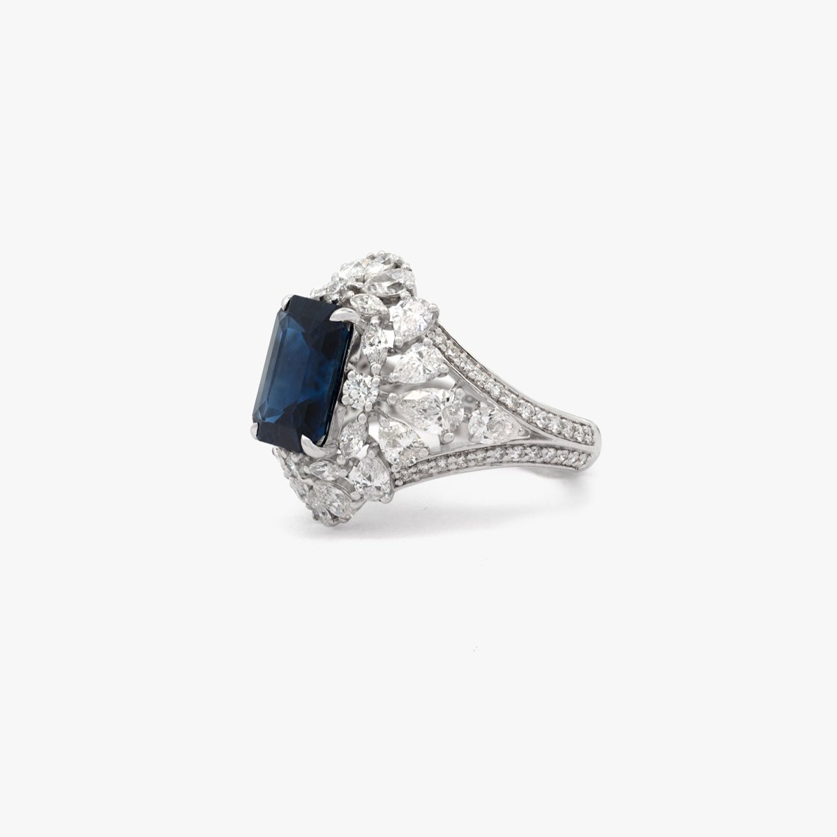 A blue sapphire center, encircled by round, marquise and pear-shaped diamonds on a pave band, embodying timeless allure.