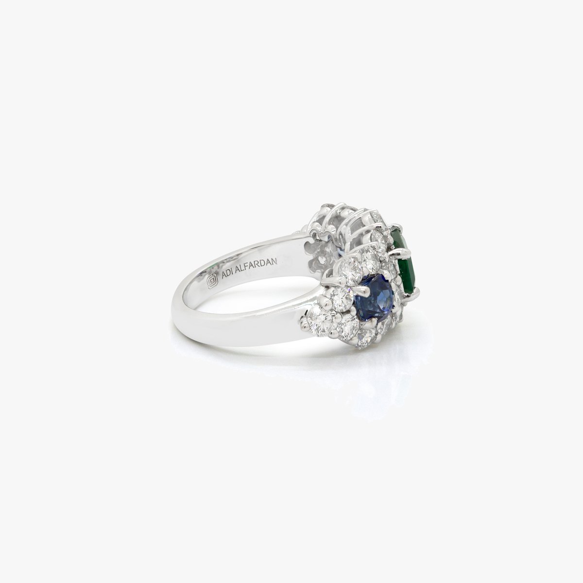 A blend of emerald and blue sapphire centers, surrounded by round diamonds, creating a symphony of color and sparkle.