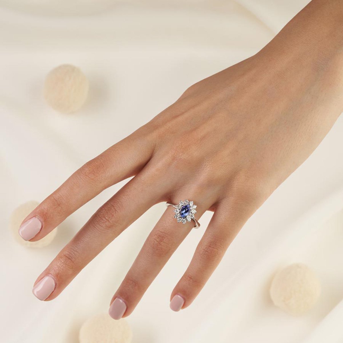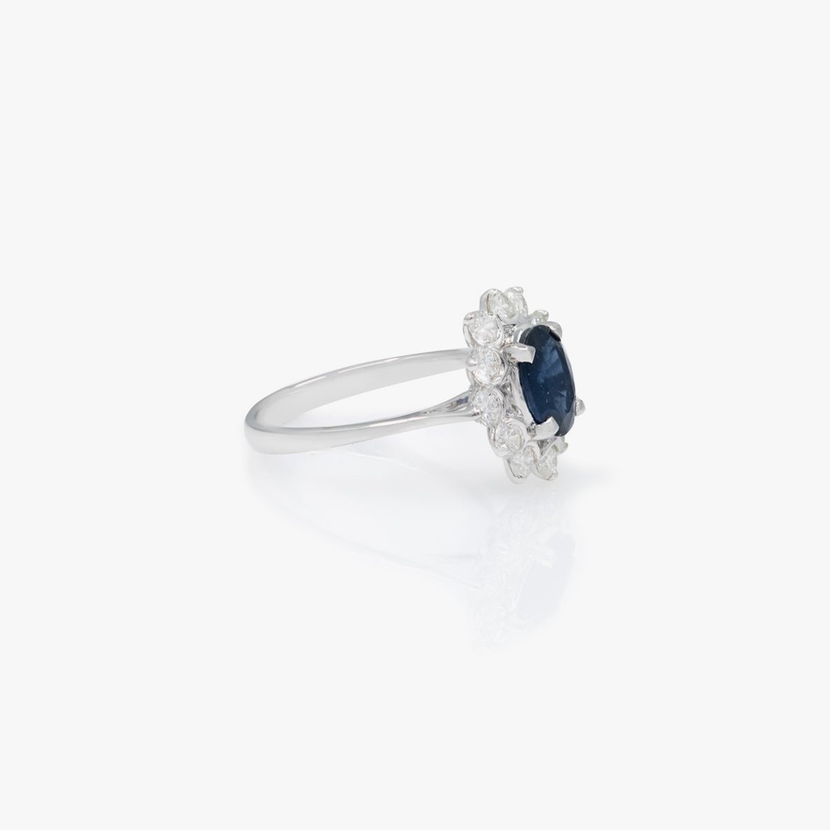 A blue sapphire oval center, surrounded by round diamonds, embodying the twinkle of starlight.