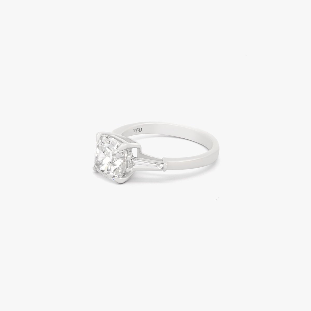 A luxurious cushion-shaped center diamond ring with baguette side diamonds, crafted with the highest quality natural diamonds. Diamonds above 0.3 carats are GIA Certified.