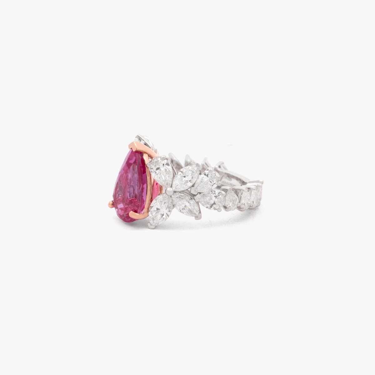 A pear-shaped pink sapphire framed by a butterfly-inspired band of fine natural diamonds.