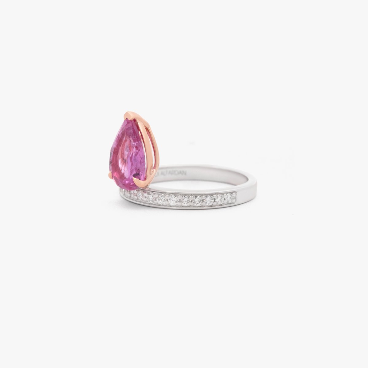 A full eternity band crowned with a pear-shaped pink sapphire, embodying elegance and royalty.