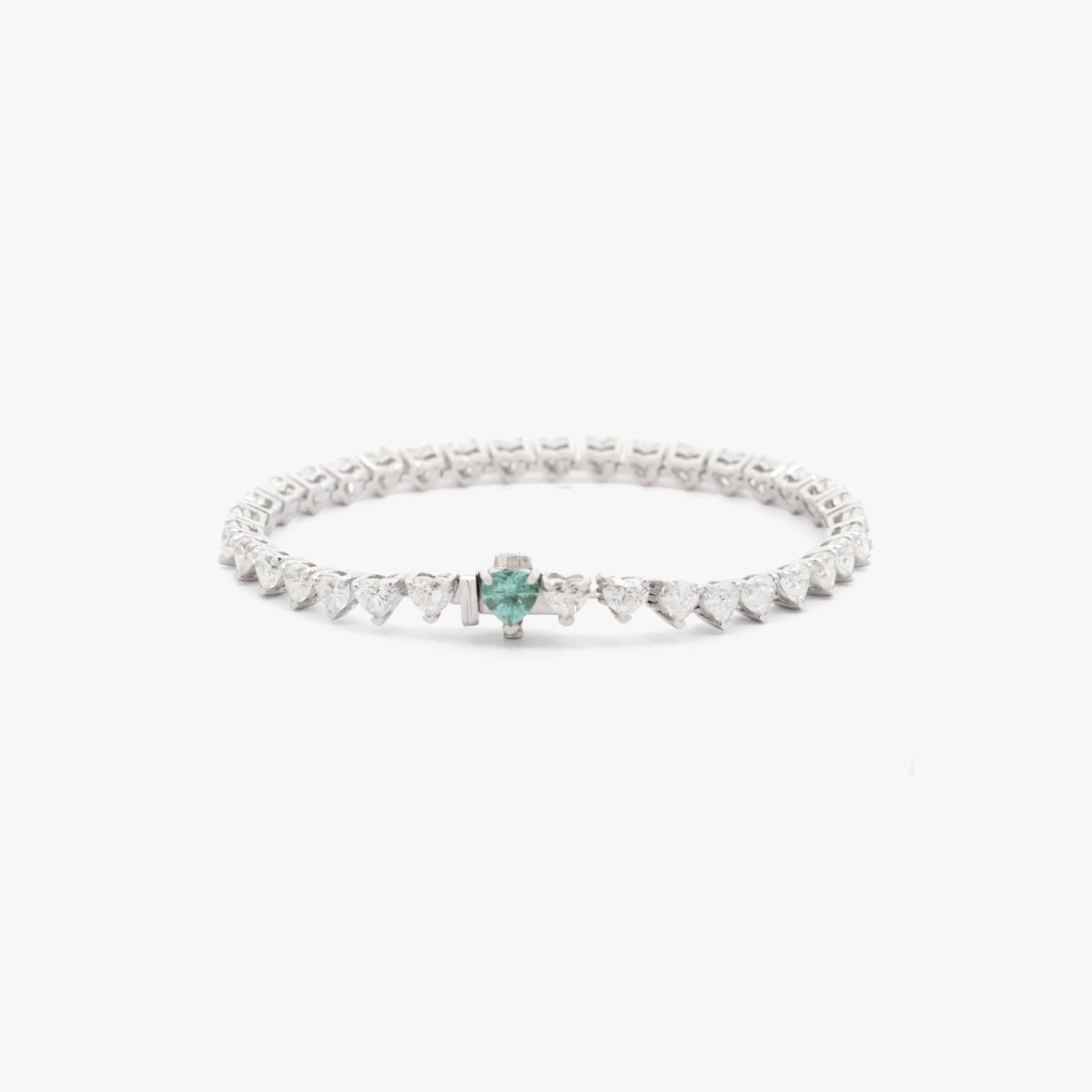 A delicate heart-shaped diamond tennis bracelet, fastened with a captivating heart-shaped Paraiba tourmaline lock.