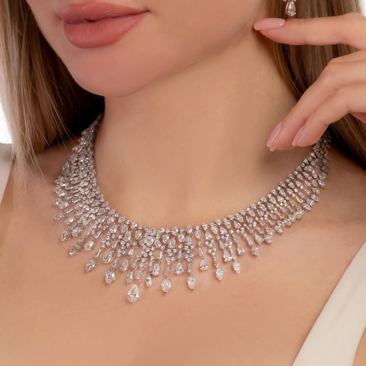 A luminous fusion of pear, marquise, round, and baguette diamonds, with delicate formations of diamond flowers interwoven between shimmering stars. A true celestial wonder.