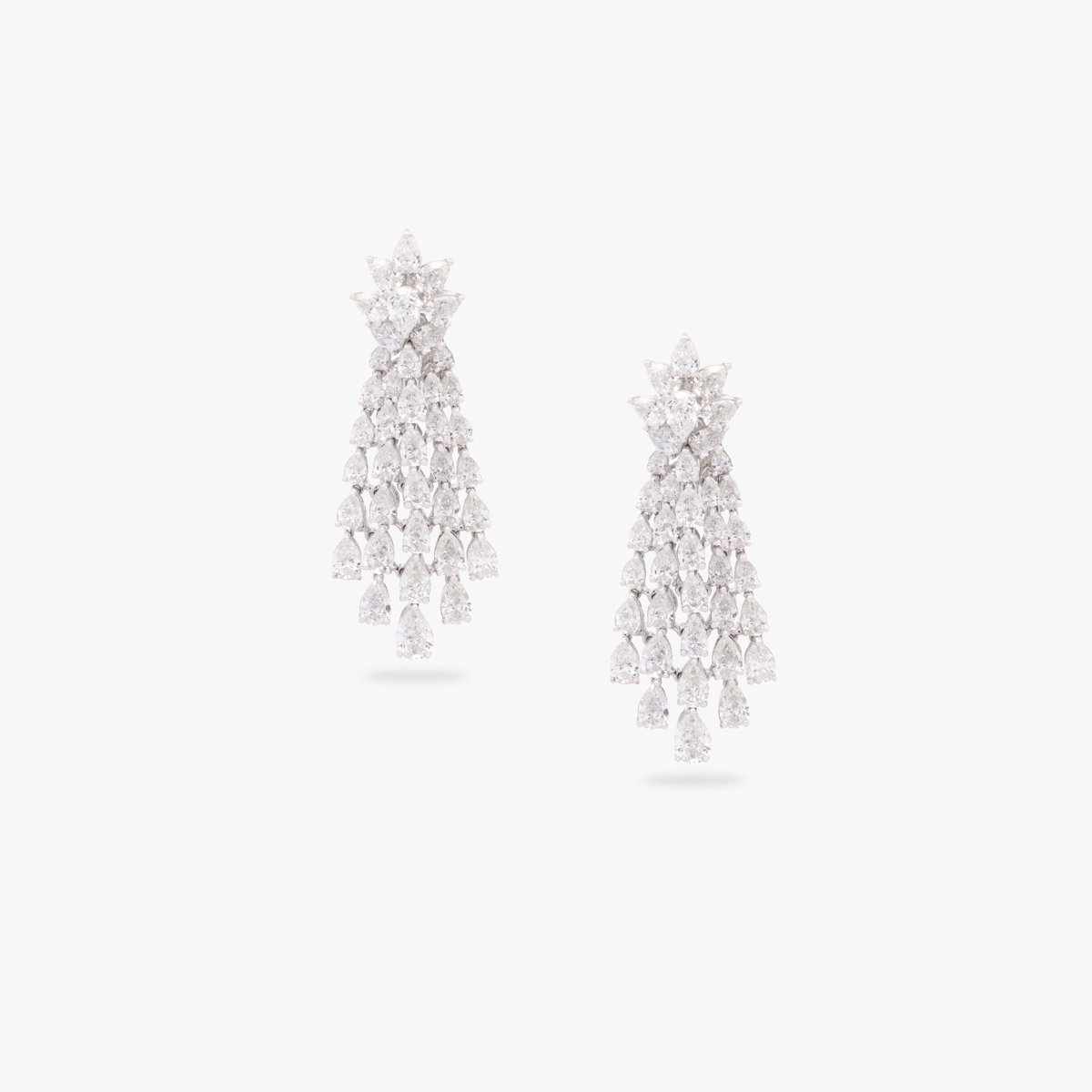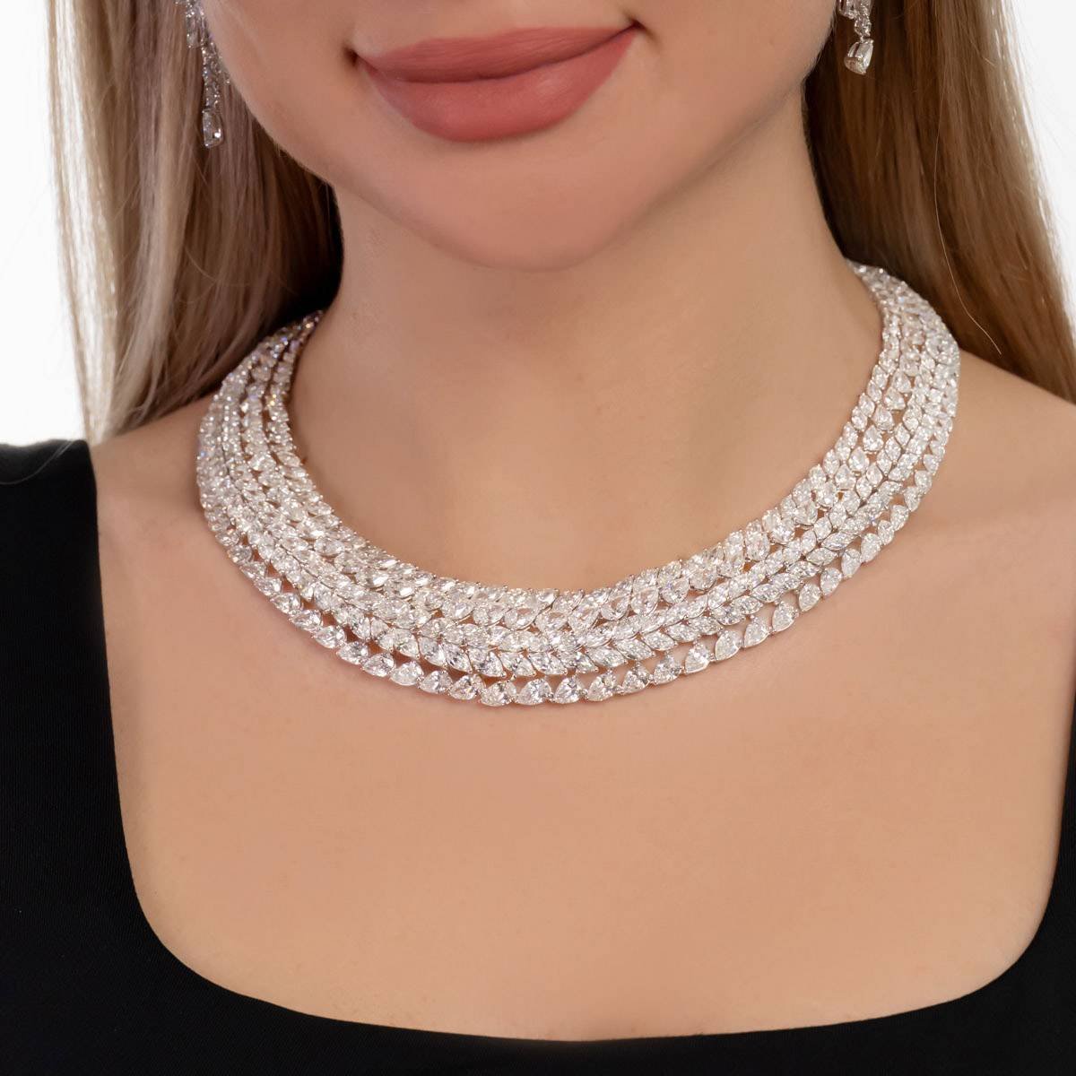 An intricate four-layered masterpiece, blending marquise and pear-shaped diamonds in a mesmerizing tennis formation, seamlessly transitioning from classic to reverse marquise, culminating in pear-shaped brilliance. Includes earrings, a necklace, and a ring.