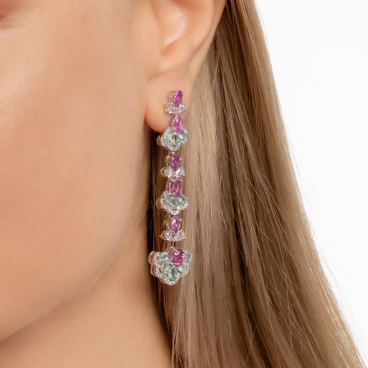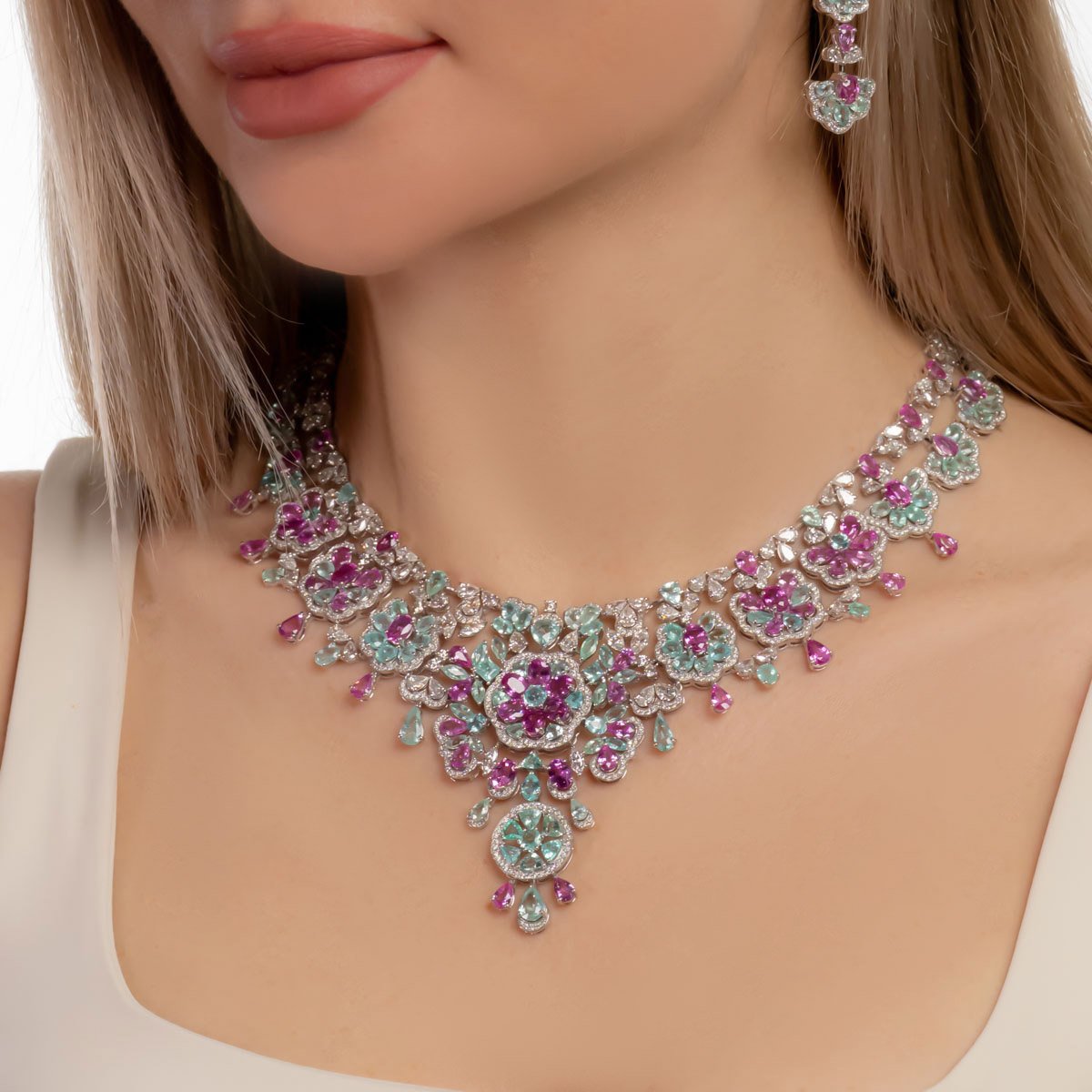 A dreamlike blend of pink sapphires and Paraiba tourmalines, accented with dazzling white diamonds in a grand and elongated design. Includes earrings and a necklace.