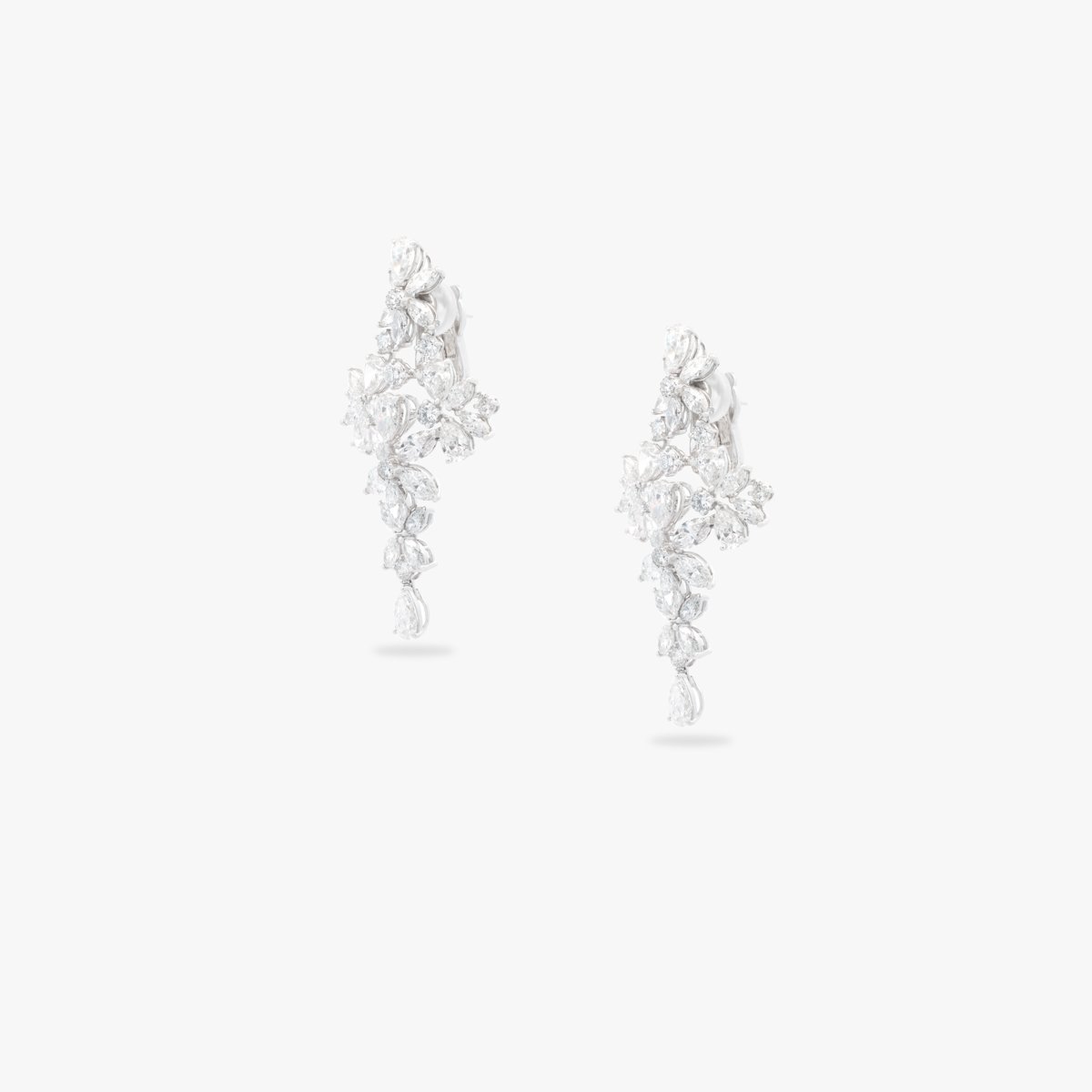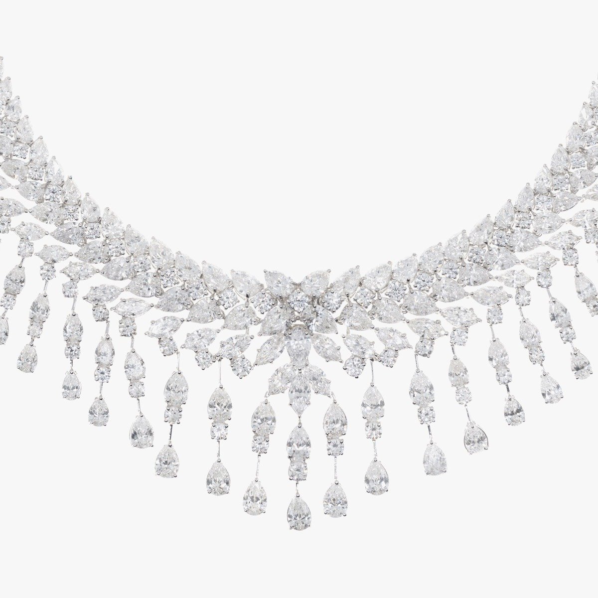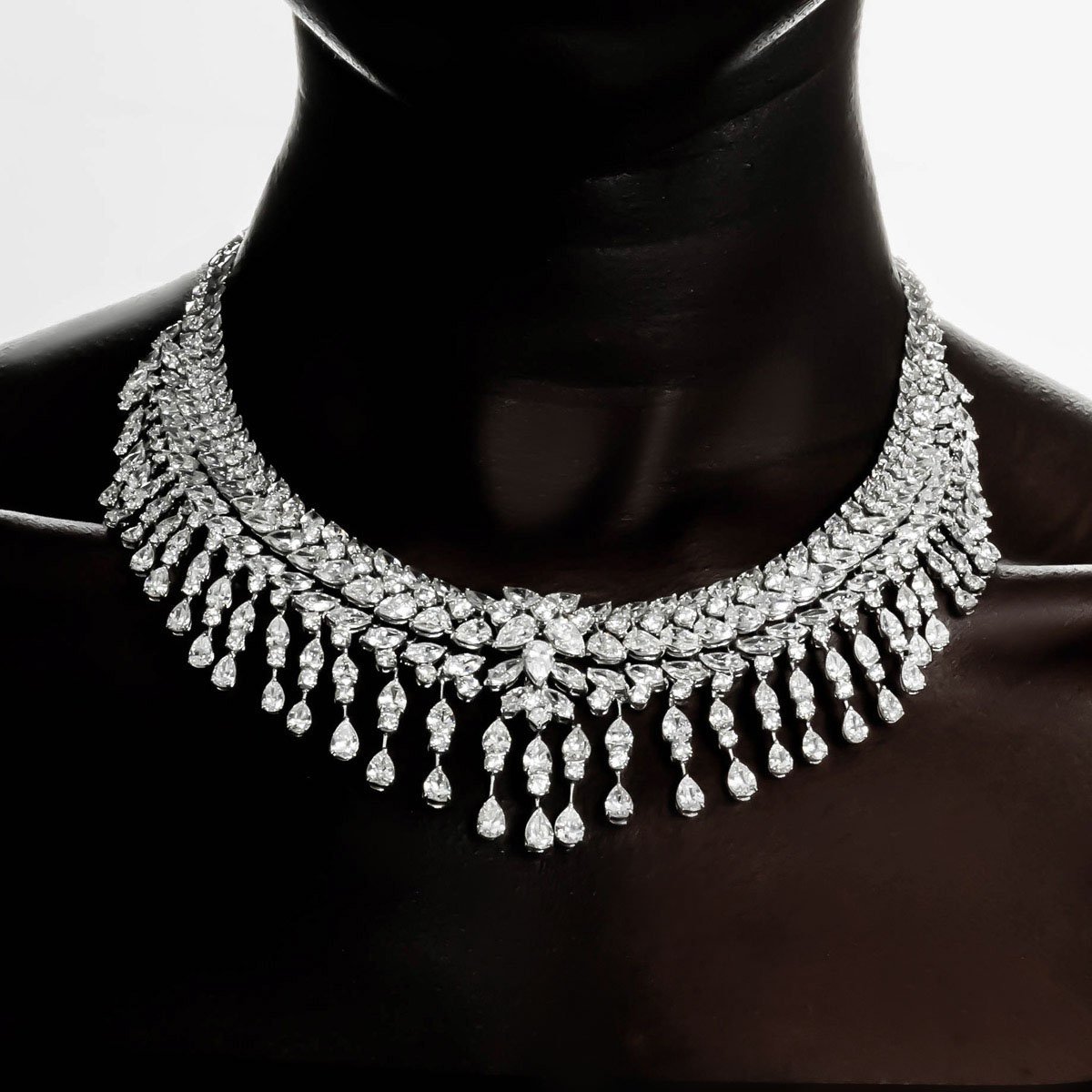 A multi-layered composition of diamonds, with pear-shaped, round, and cushion cuts, forming star-like motifs and cascading pear-shaped drops. Includes earrings and a necklace.