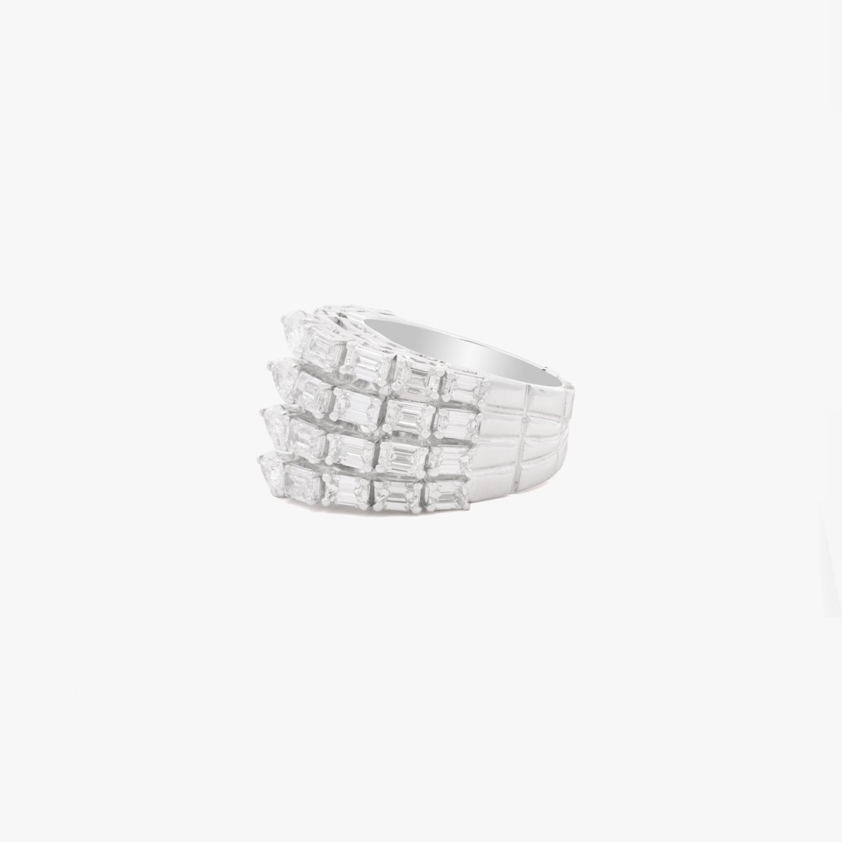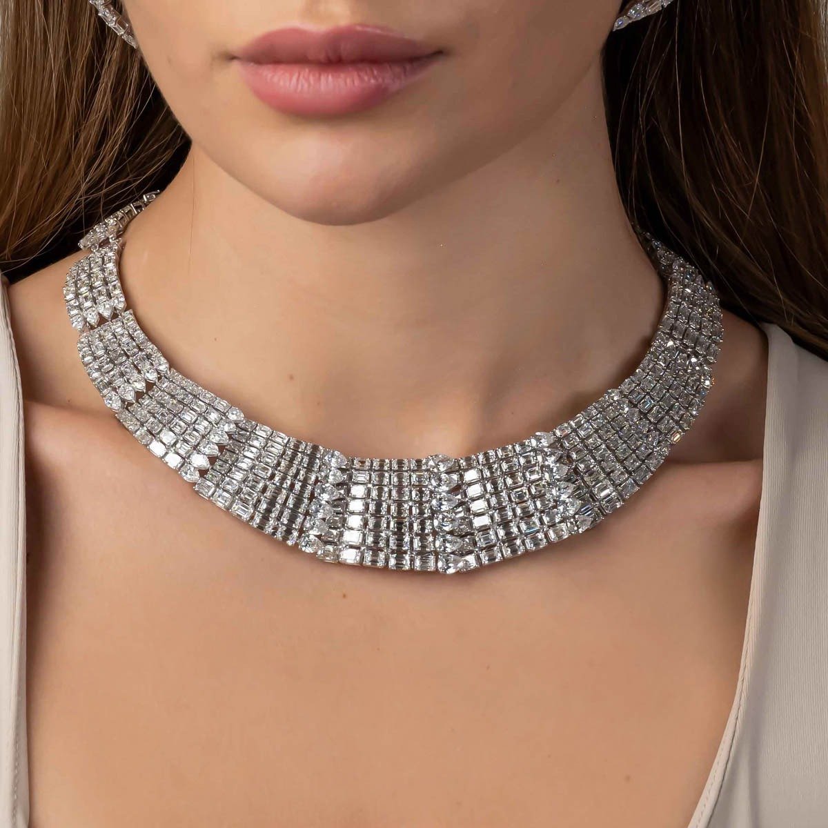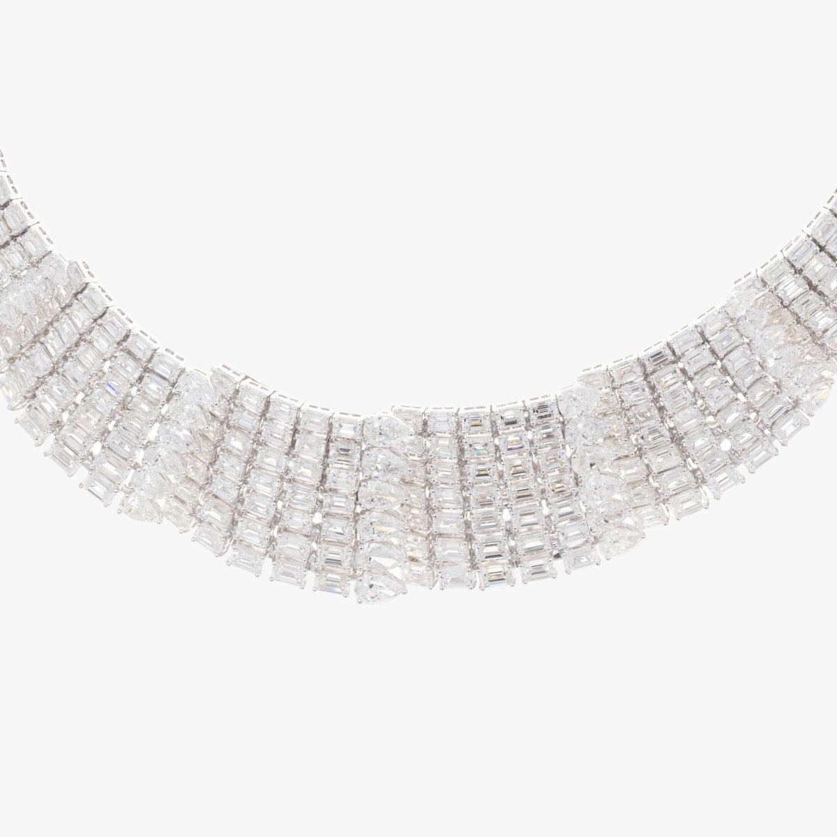 A seven-layer creation, combining emerald-cut and pear-shaped diamonds, arranged in a symphony of light and movement. Includes a necklace, earrings, and a ring.