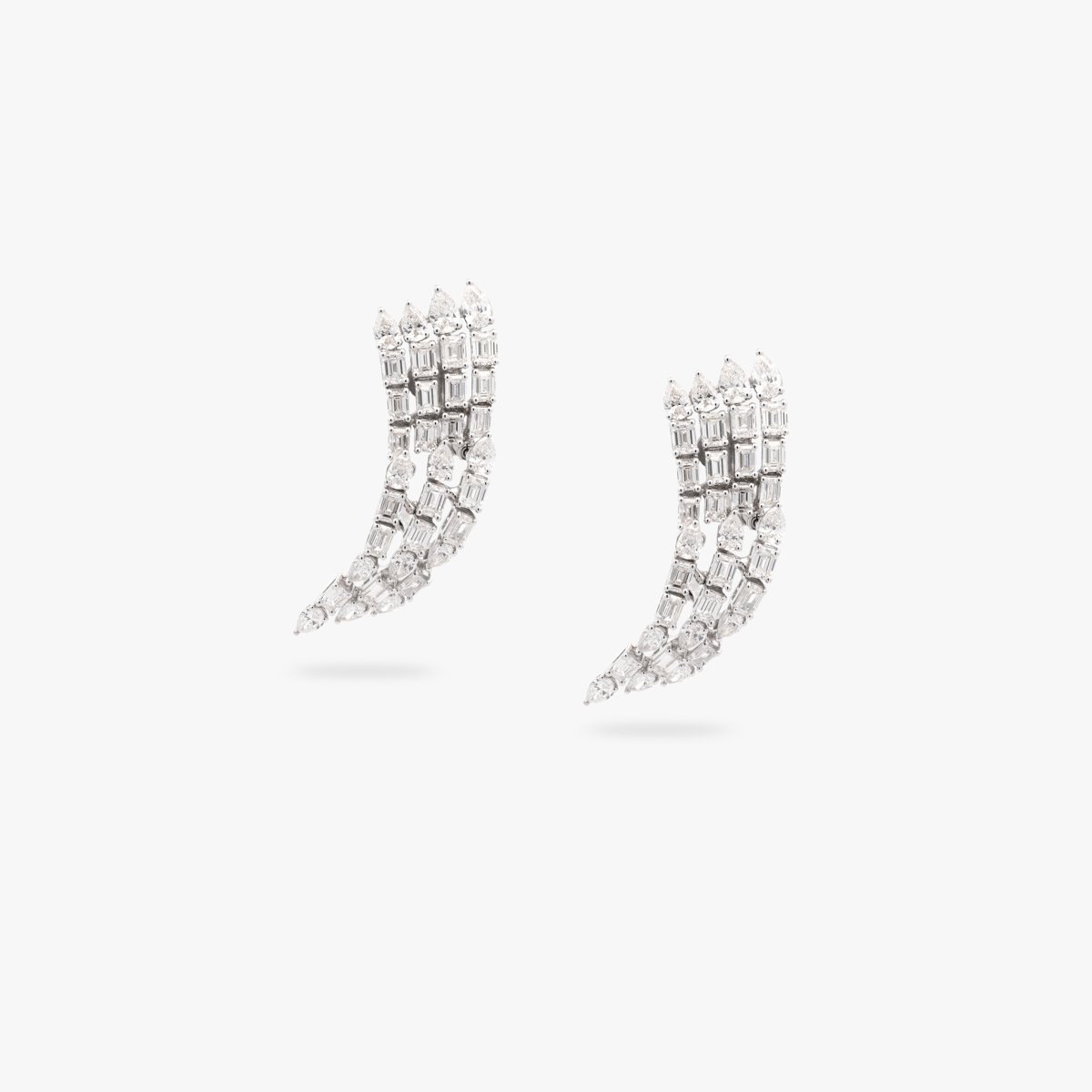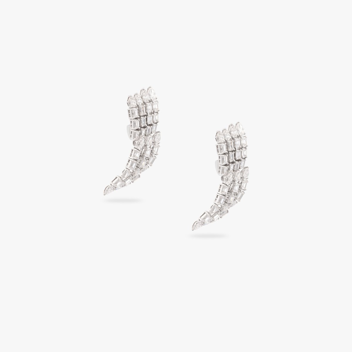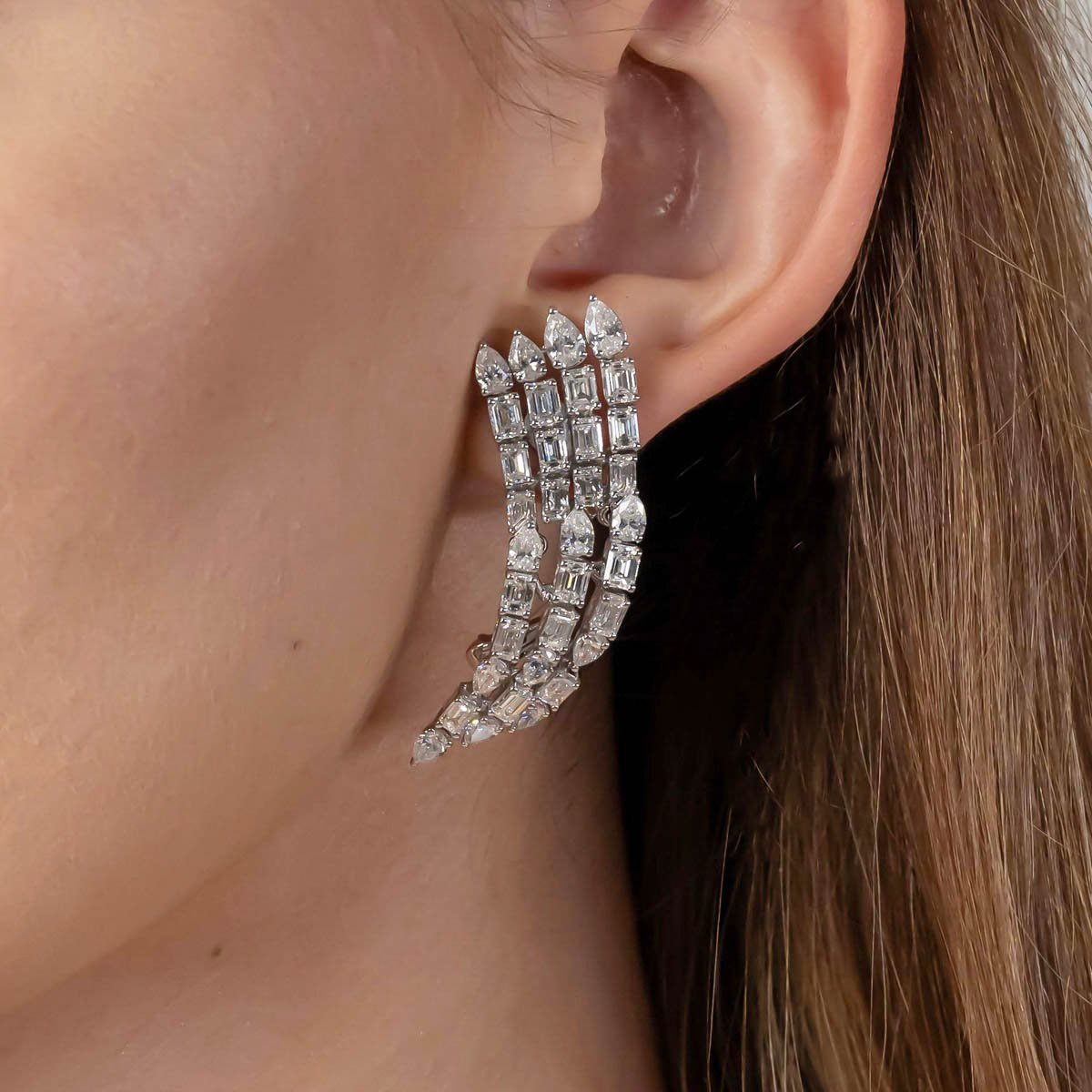 A seven-layer creation, combining emerald-cut and pear-shaped diamonds, arranged in a symphony of light and movement. Includes a necklace, earrings, and a ring.