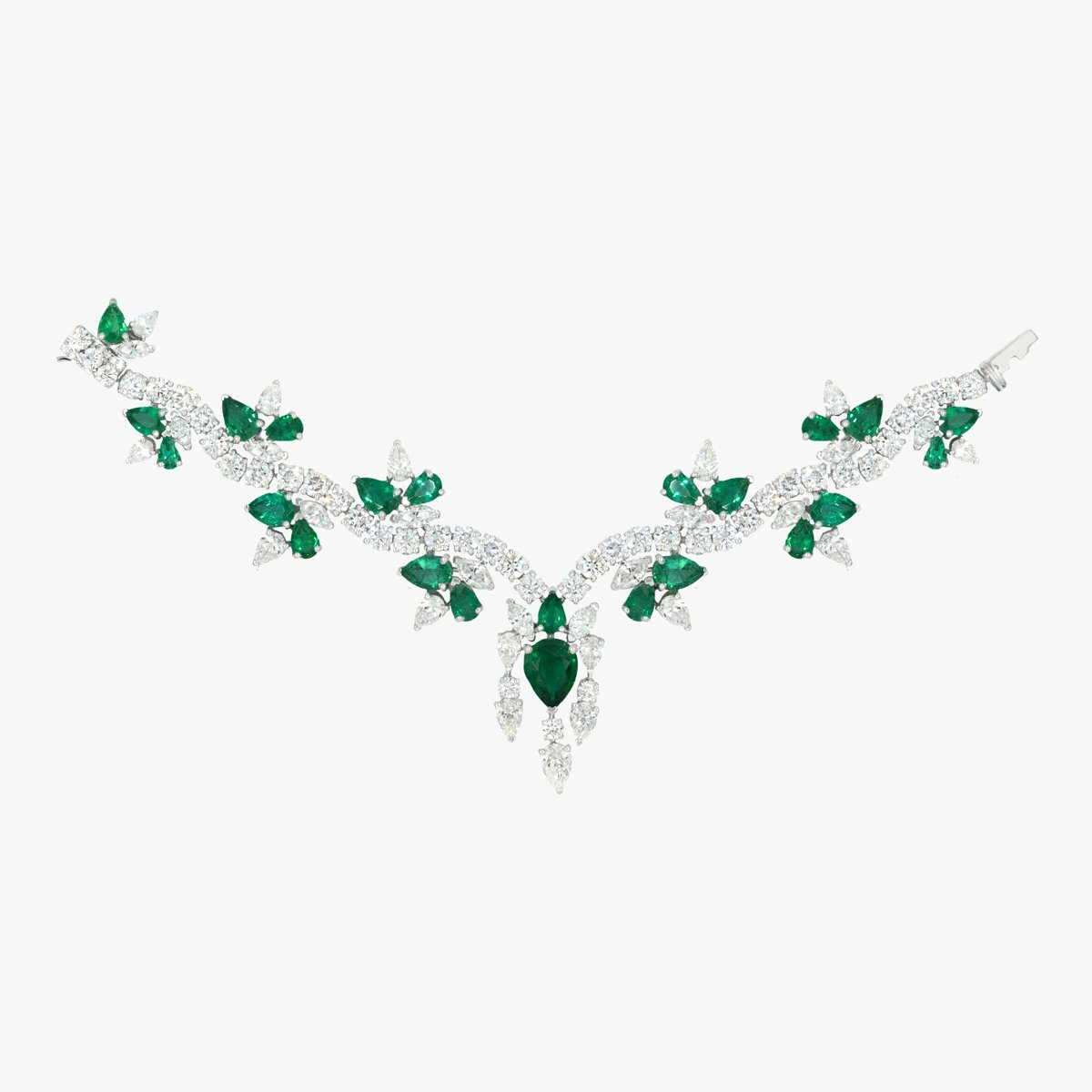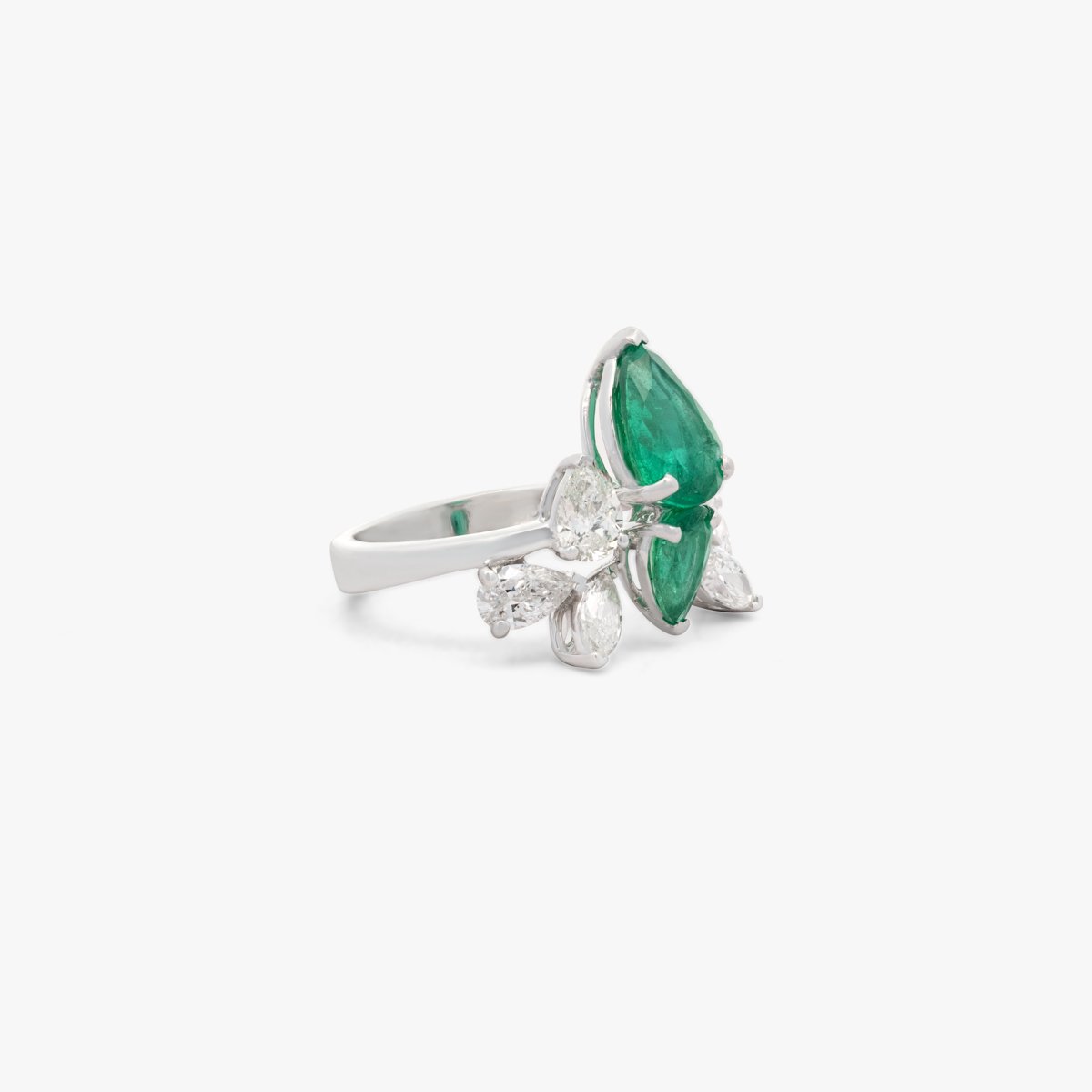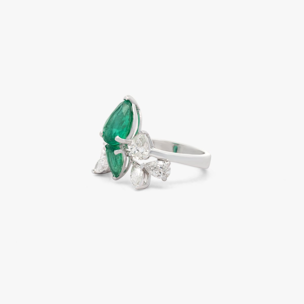 An exquisite emerald ensemble, crafted with the highest quality pear-shaped green emeralds, paired with round and pear-shaped white diamonds in a design reminiscent of winter snowfall. The ring features a bee-inspired design, adding a unique touch. Includes a ring, earrings, necklace, and bracelet.