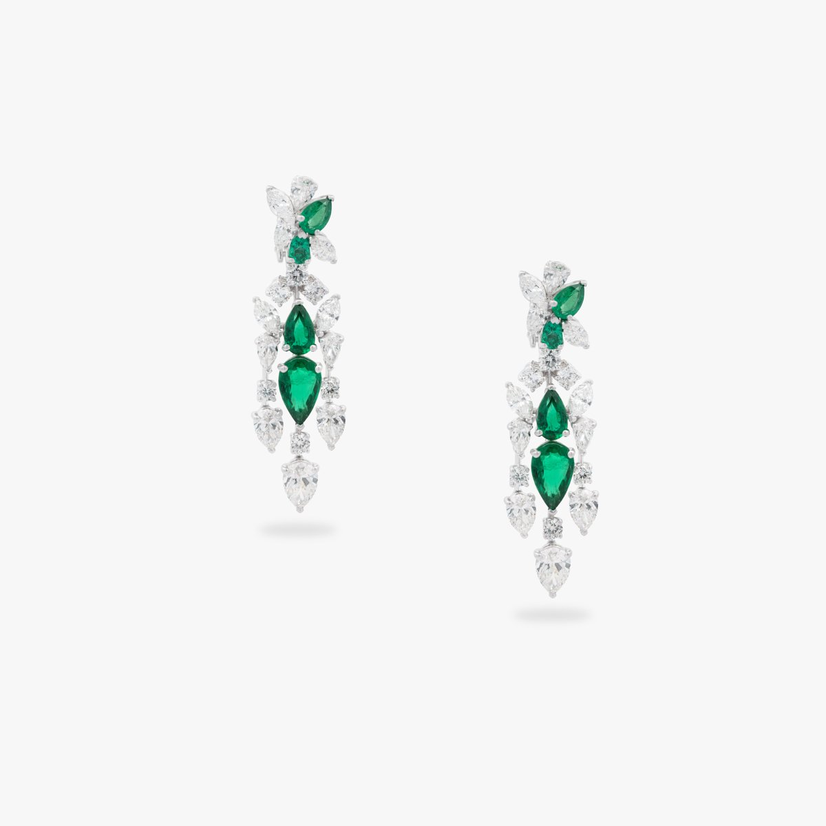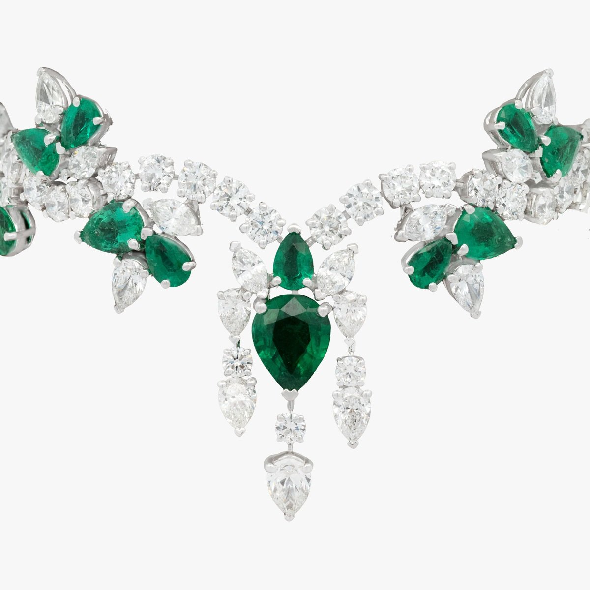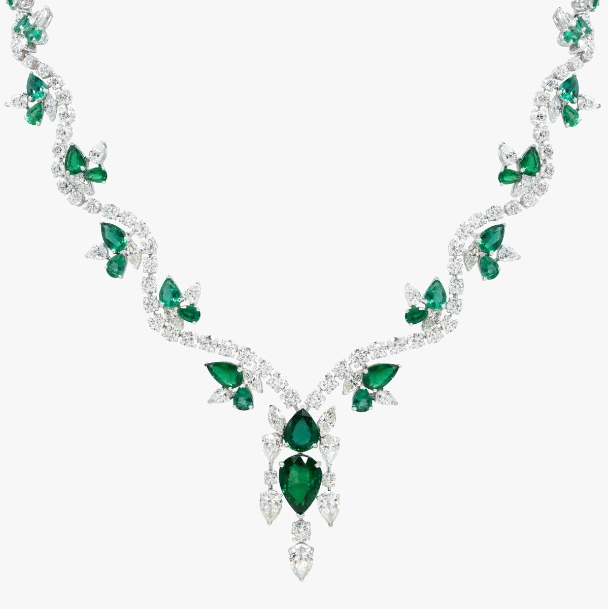 An exquisite emerald ensemble, crafted with the highest quality pear-shaped green emeralds, paired with round and pear-shaped white diamonds in a design reminiscent of winter snowfall. The ring features a bee-inspired design, adding a unique touch. Includes a ring, earrings, necklace, and bracelet.