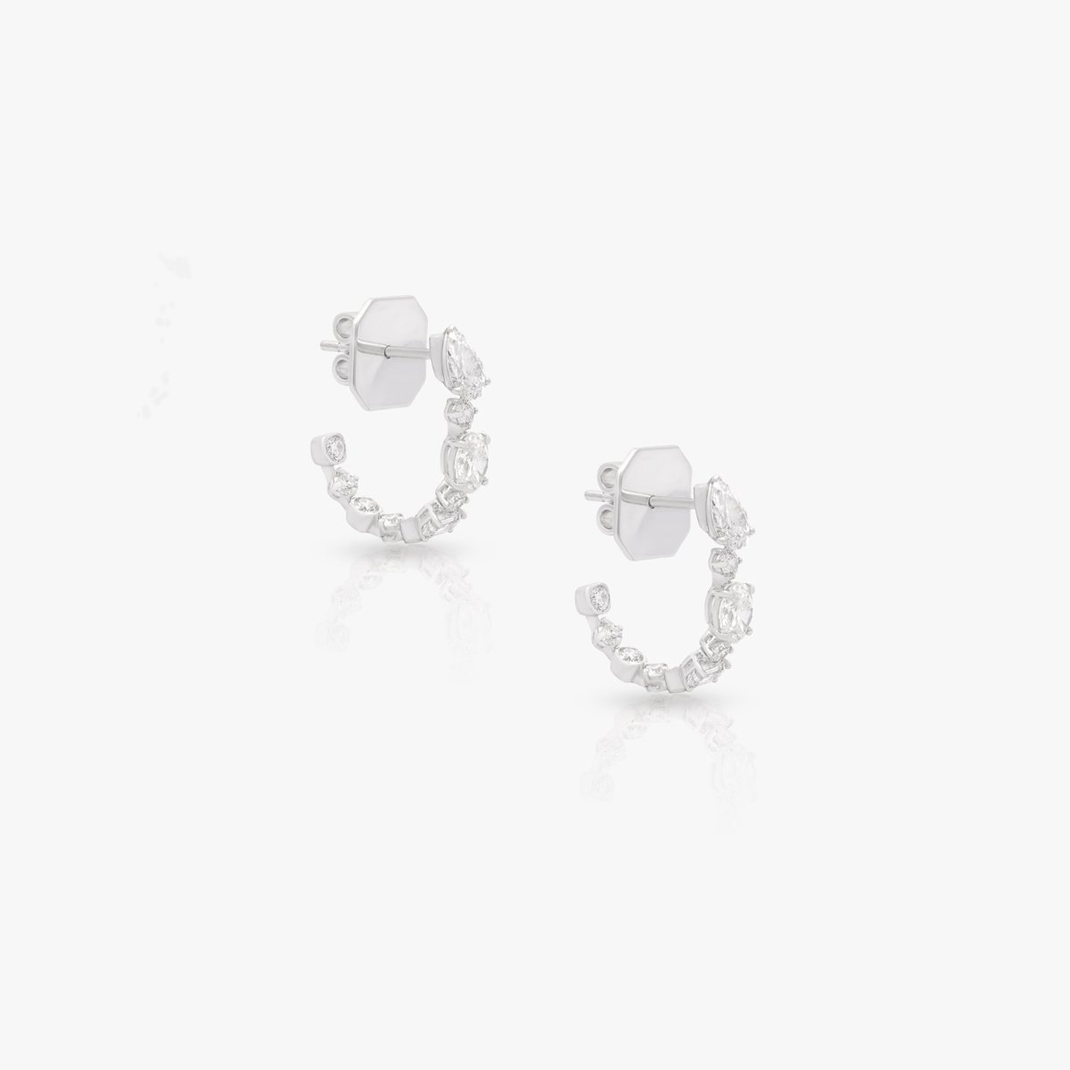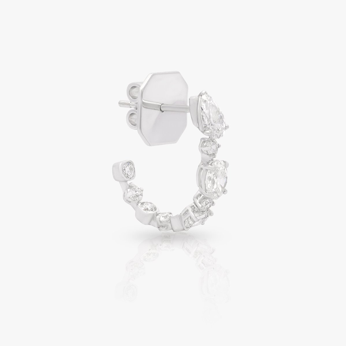 Half hoop earrings featuring round, oval, and pear-shaped diamonds. Each diamond above 0.3 carats is GIA Certified, offering exceptional brilliance.