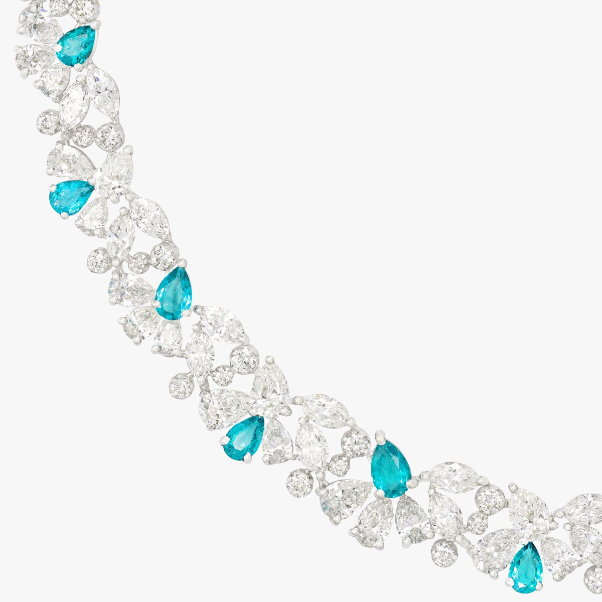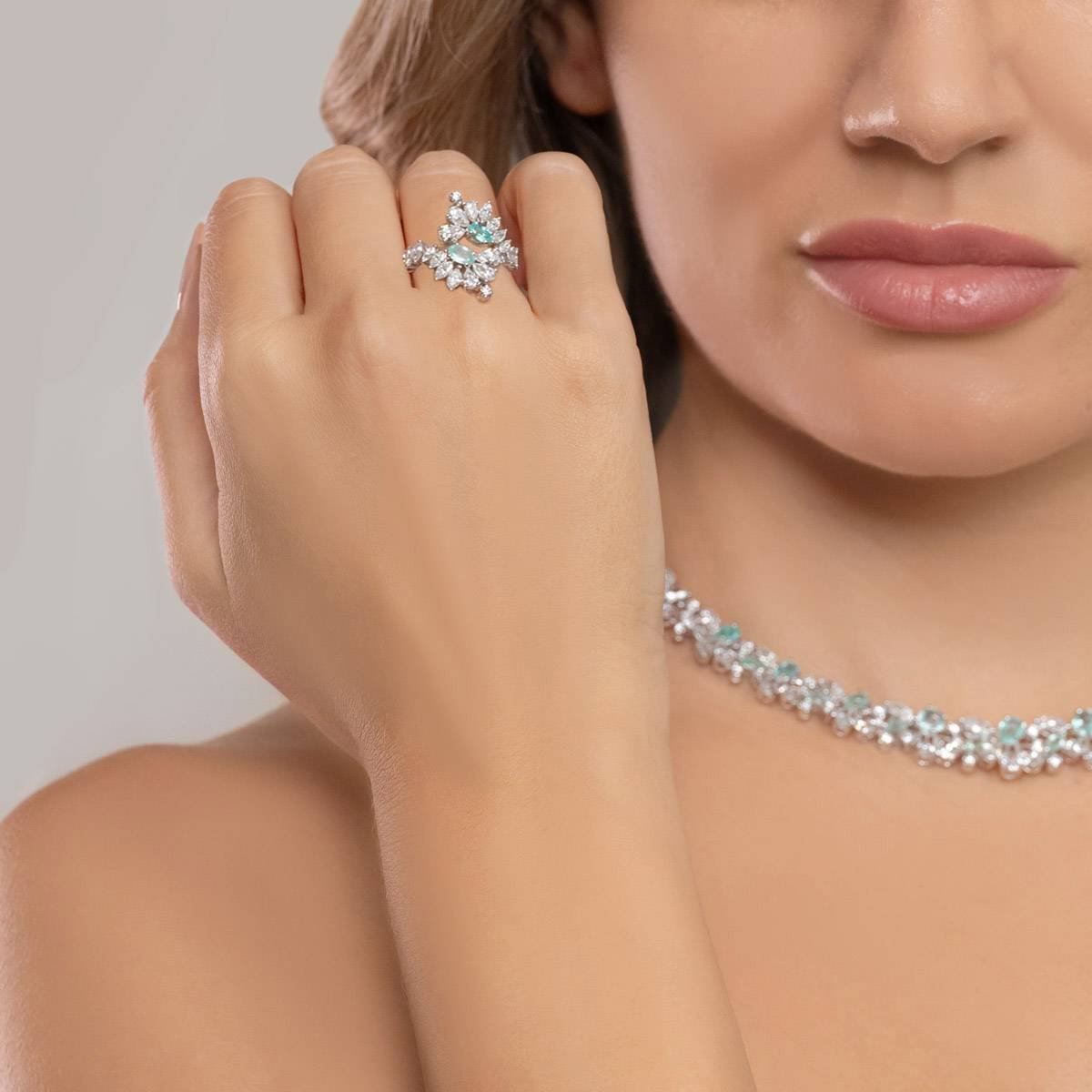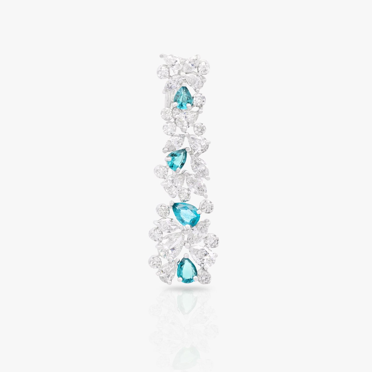 A unique set featuring the captivating blue-green hue of Paraiba tourmaline gemstones paired with white diamonds. Each diamond above 0.3 carats is GIA Certified, ensuring top-notch quality and brilliance. F, G, and H colors with VS+ clarity.