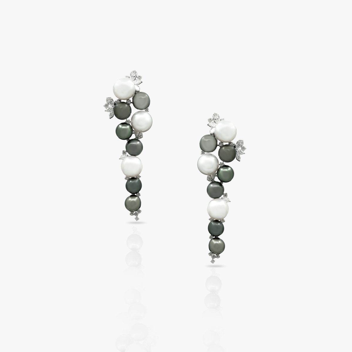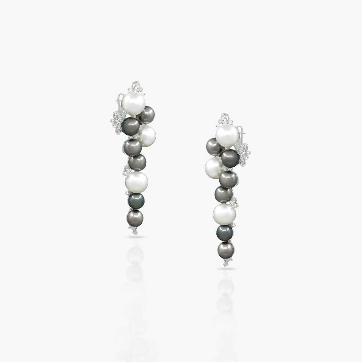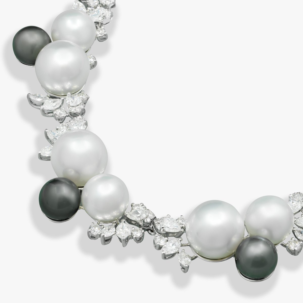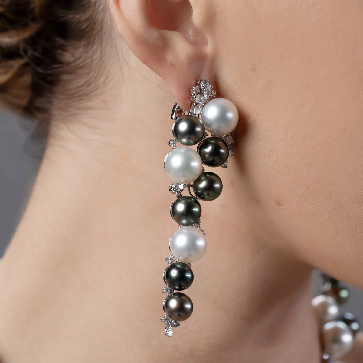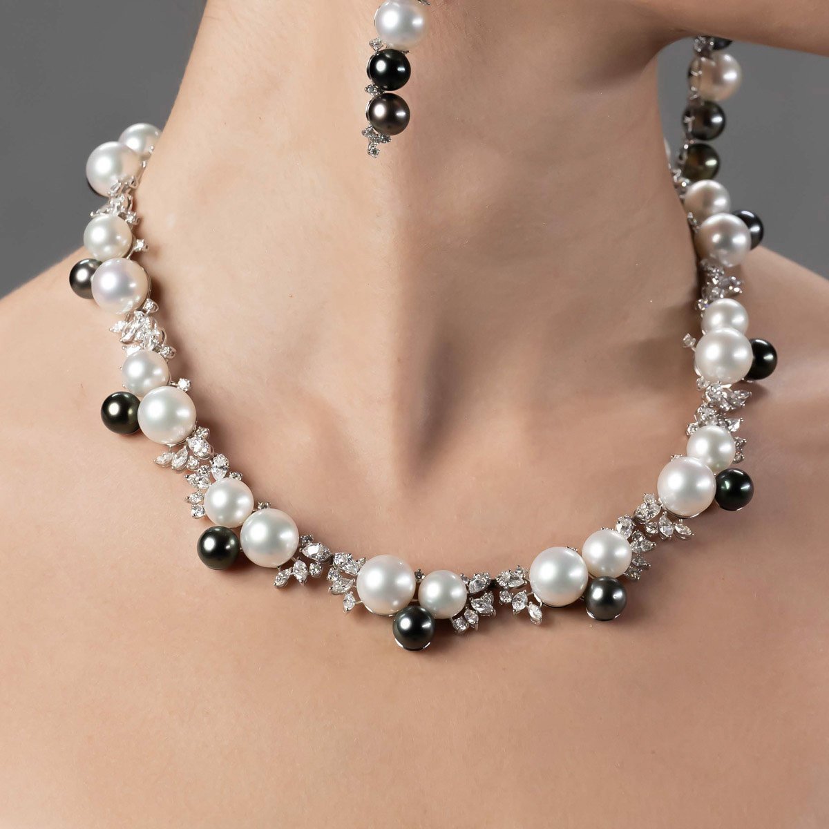 An elegant set combining fine-quality pearls with natural diamonds. This exquisite ensemble showcases the perfect harmony between the lustrous pearls and sparkling diamonds. Each diamond above 0.3 carats is GIA Certified. F, G, and H colors with VS+ clarity.