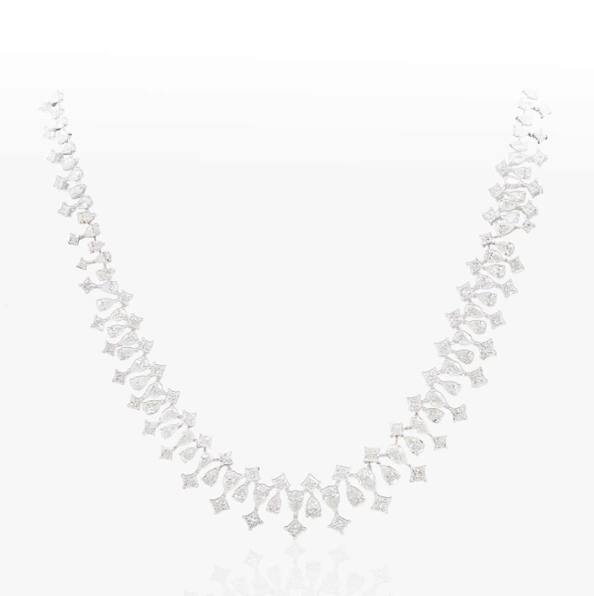 An exquisite set featuring pear and princess-cut diamonds. This set includes a necklace, earrings, and a ring, all showcasing fine-quality natural diamonds. Each diamond above 0.3 carats is GIA Certified, offering unmatched brilliance and quality. F, G, and H colors with VS+ clarity.