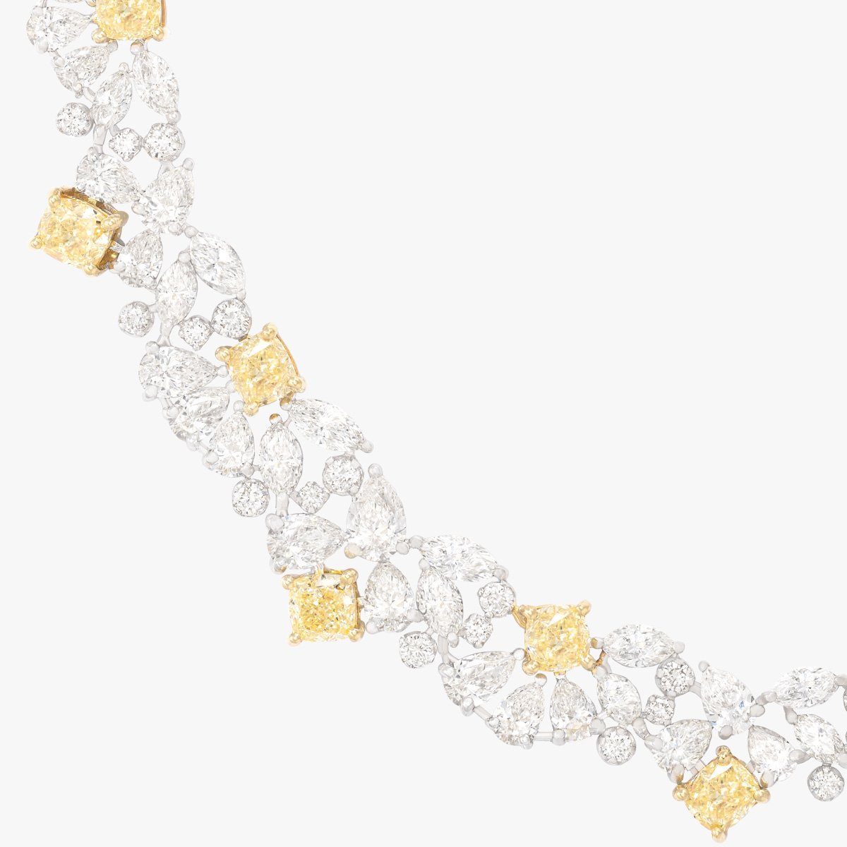 A necklace featuring a harmonious blend of yellow diamonds and white diamonds. Each diamond is of fine quality, with any diamond above 0.3 carats being GIA Certified. F, G, and H colors with VS+ clarity.