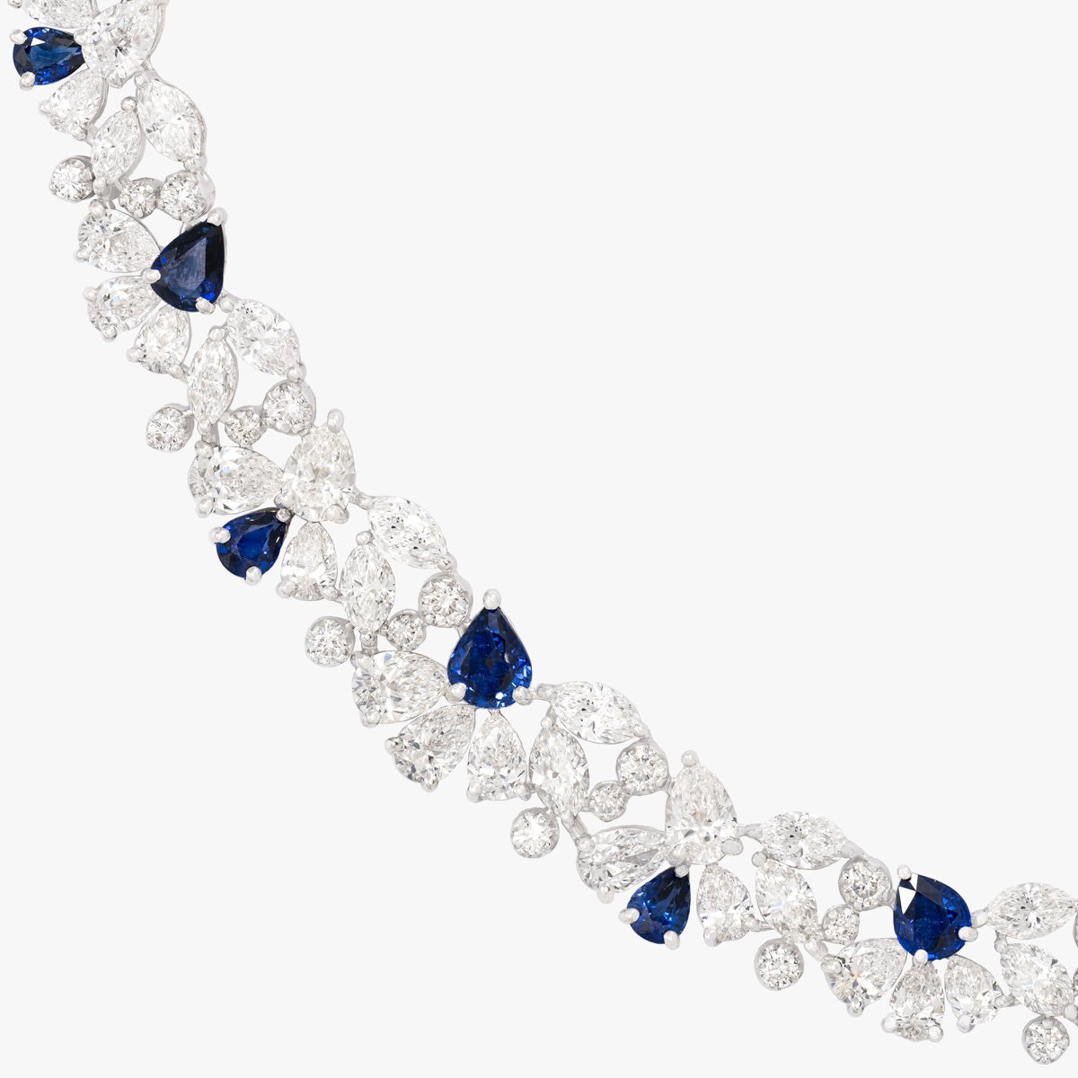 A magnificent necklace showcasing a beautiful combination of blue sapphire gemstones and white diamonds. This piece features fine-quality natural diamonds, each above 0.3 carats and GIA Certified. F, G, and H colors with VS+ clarity.