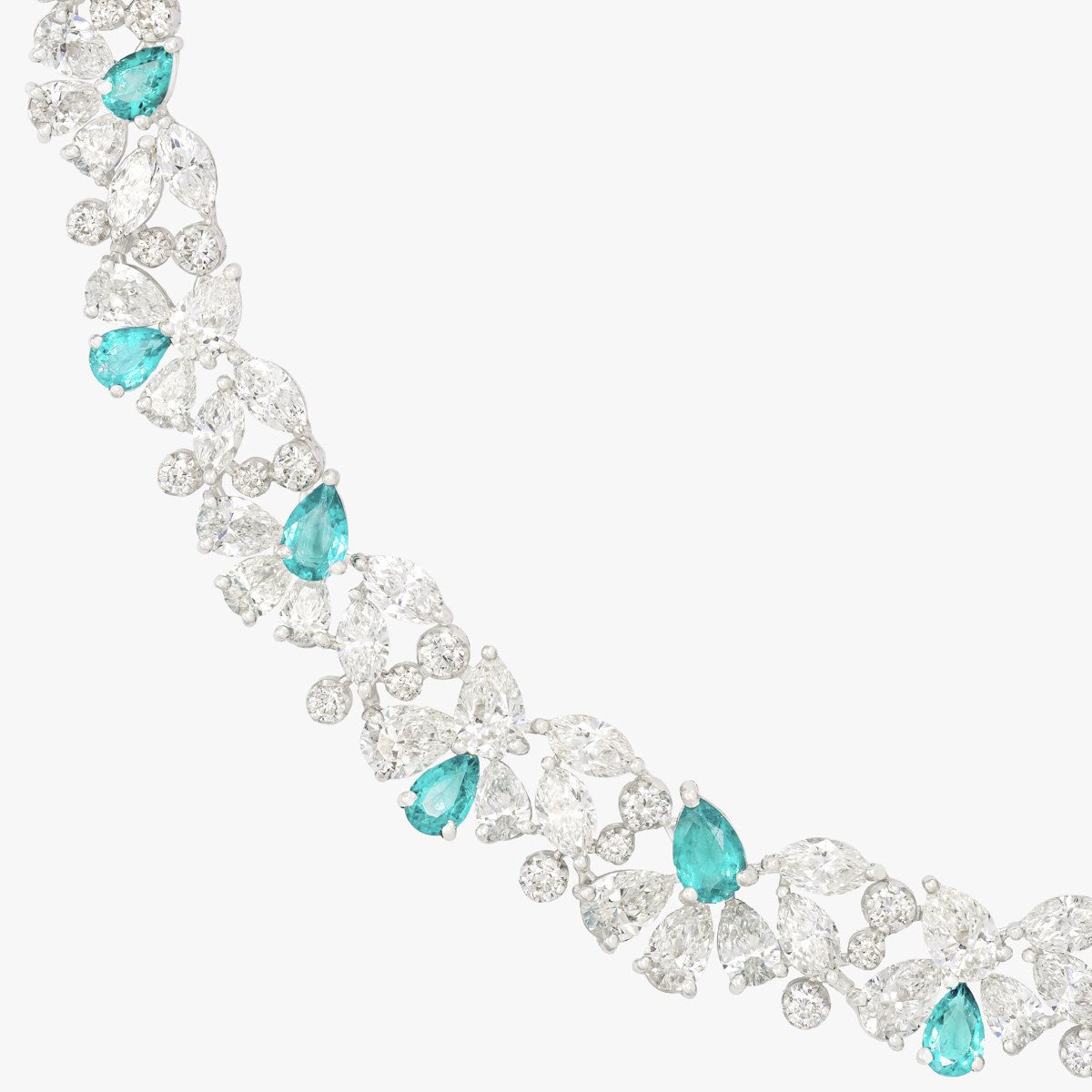 An extraordinary necklace adorned with paraiba tourmaline gemstones and white diamonds. This piece highlights fine-quality natural diamonds, each above 0.3 carats and GIA Certified. F, G, and H colors with VS+ clarity.