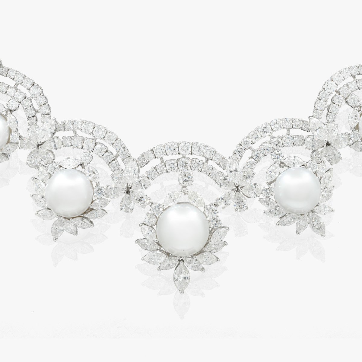 A luxurious necklace featuring fine-quality natural diamonds and South Sea pearls. This stunning piece boasts 64.29 carats of exceptional diamonds, creating a breathtaking display of elegance. Each diamond above 0.3 carats is GIA Certified. F, G, and H colors with VS+ clarity.