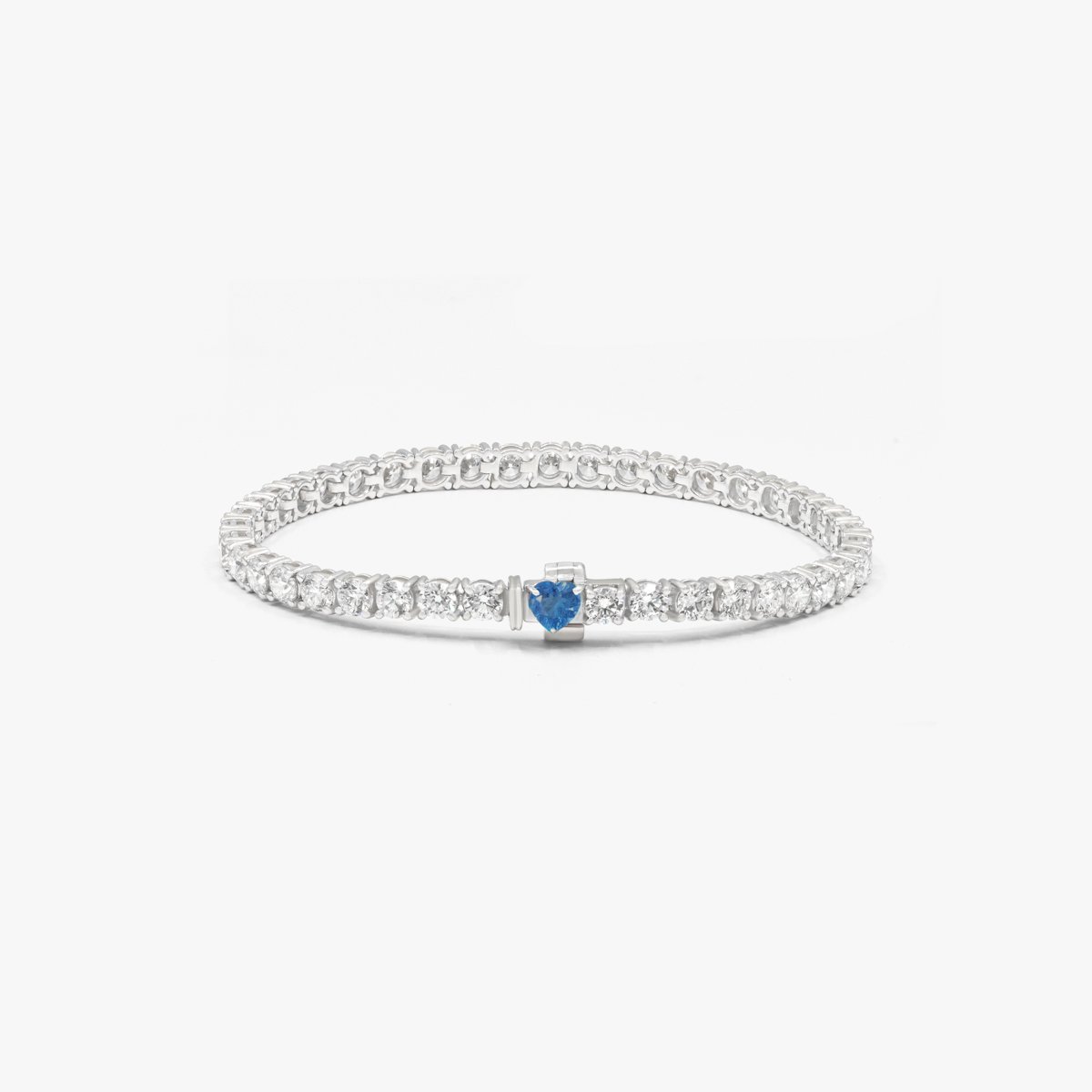 A stunning round-shaped tennis bracelet with a blue sapphire gemstone heart lock, featuring fine quality natural diamonds. GIA Certified diamonds above 0.4 carats, with F, G & H colors and VS+ clarity.