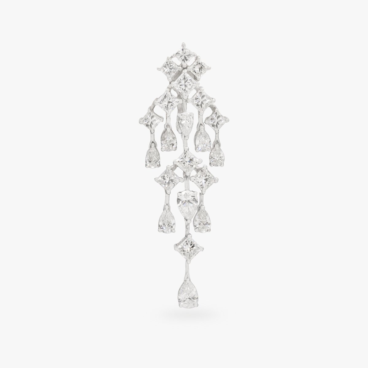 Chandelier earrings featuring pear and princess cut diamonds. These pieces showcase fine-quality natural diamonds. Each diamond above 0.3 carats is GIA Certified, offering unmatched brilliance and quality. F, G, and H colors with VS+ clarity.